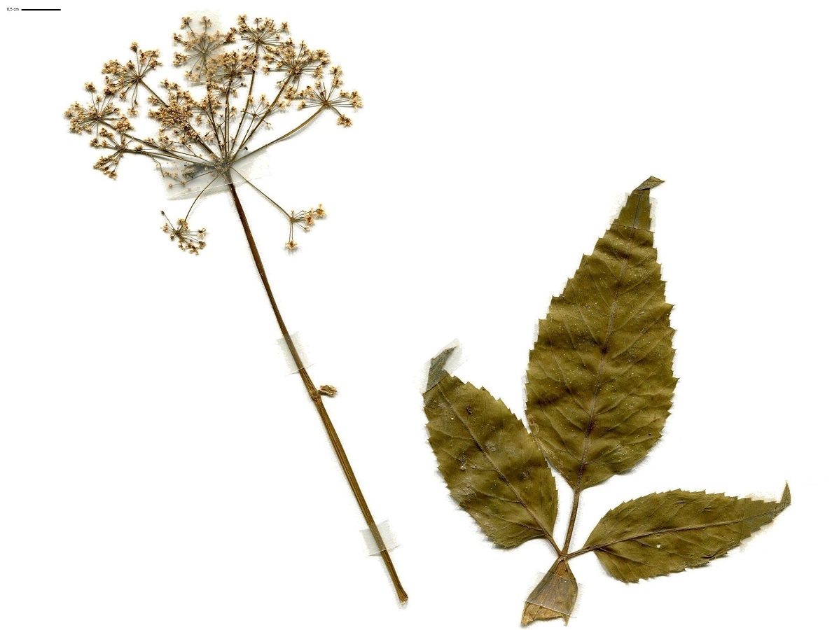Hc – 4-8 dm – Feuilles 1- à 2-ternées à segments ovales-aigus dentés, les > à pétiole renflé –10-20 Rayons, fleurs blanches (rosées), bractéoles nulles – Fruit de L 3-4 mm ovoïde aplati