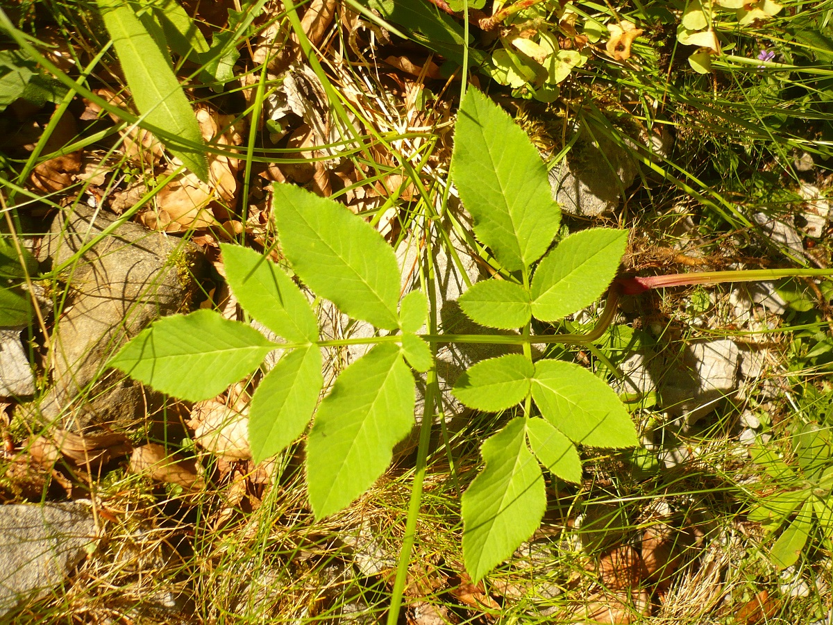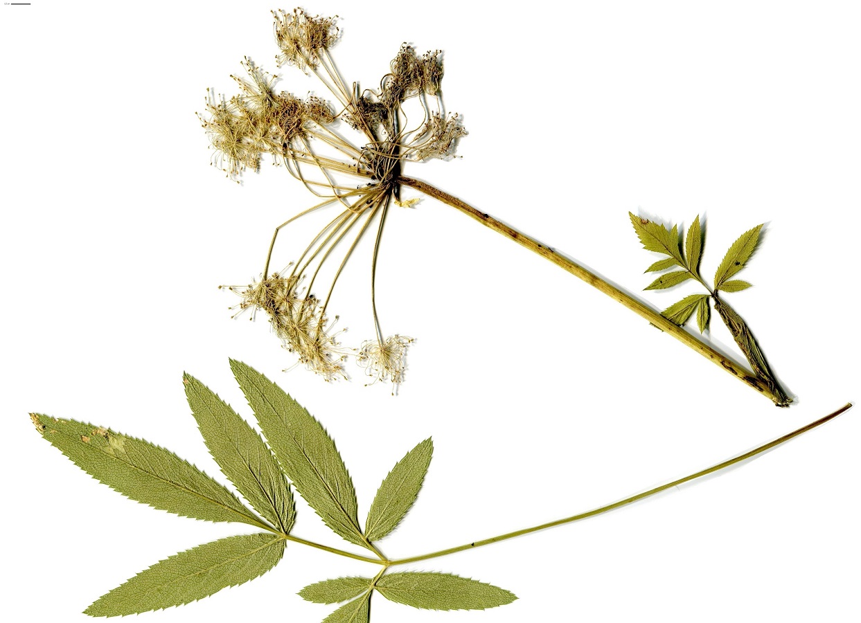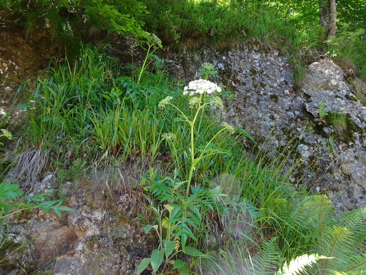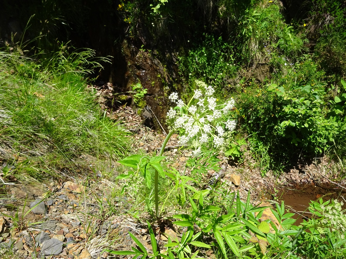 Hc – 0,5-1,5 m – Grandes feuilles bipennées à segments lancéolés finement dentés, pétiole en gouttière – Ombelle convexe à 25-40 rayons, fleurs ± rosées – Fruit ± en rectangle