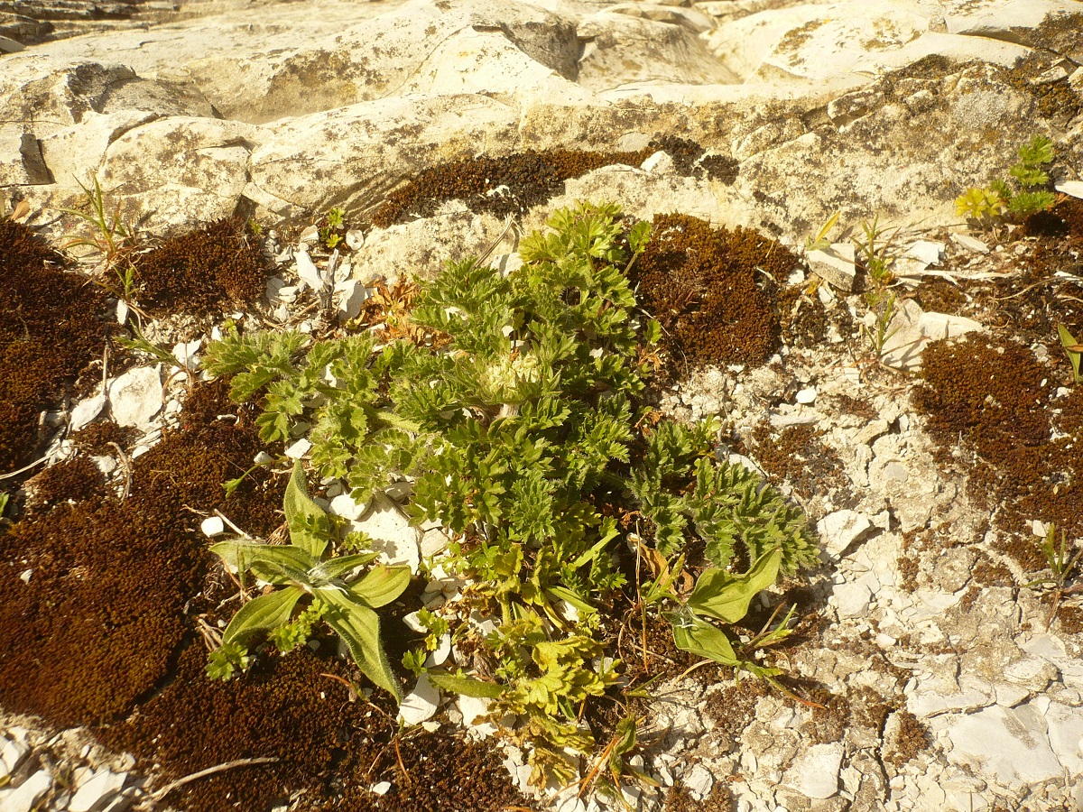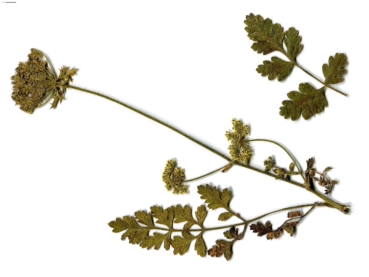 Th/Hc – 0,5-1 dm – Tige scabre, feuilles à lobes larges épais, luisants, incisés – Ombelle de 6-12 cm convexe dense, 10-15 rayons, fleurs blanc rosé, bractées trifides – Fruit de 2-4 mm épineux