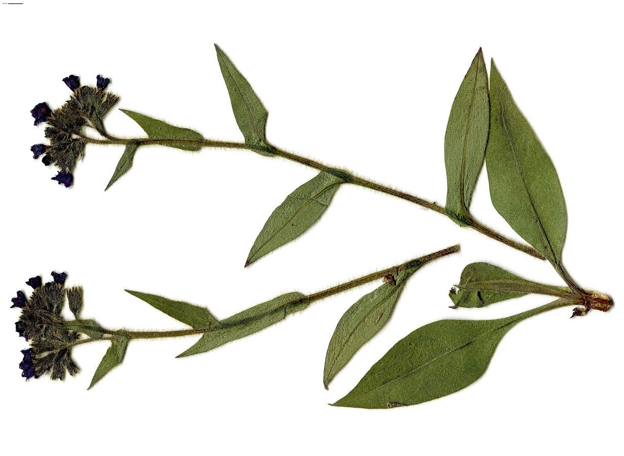 Hc – 2-4 dm – Feuilles molles ovales lancéolées non maculées, glanduleuses, peu à peu rétrécies en pétiole – Corolle en entonnoir de 12-18 mm rougeâtre puis bleue – Nucules ≃ 4,5 mm