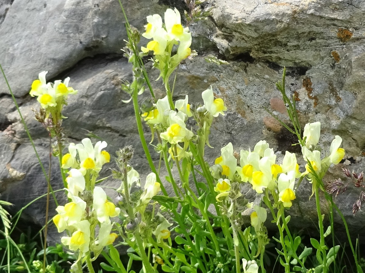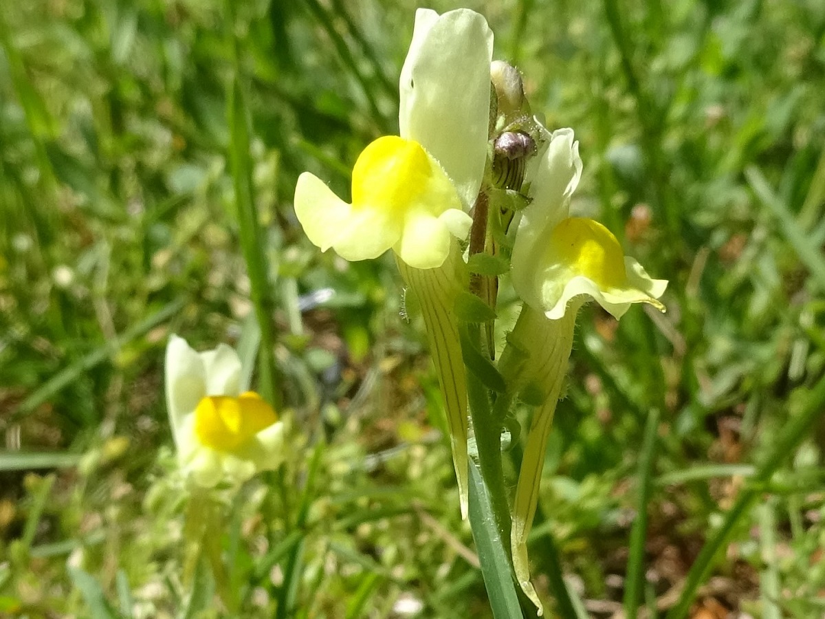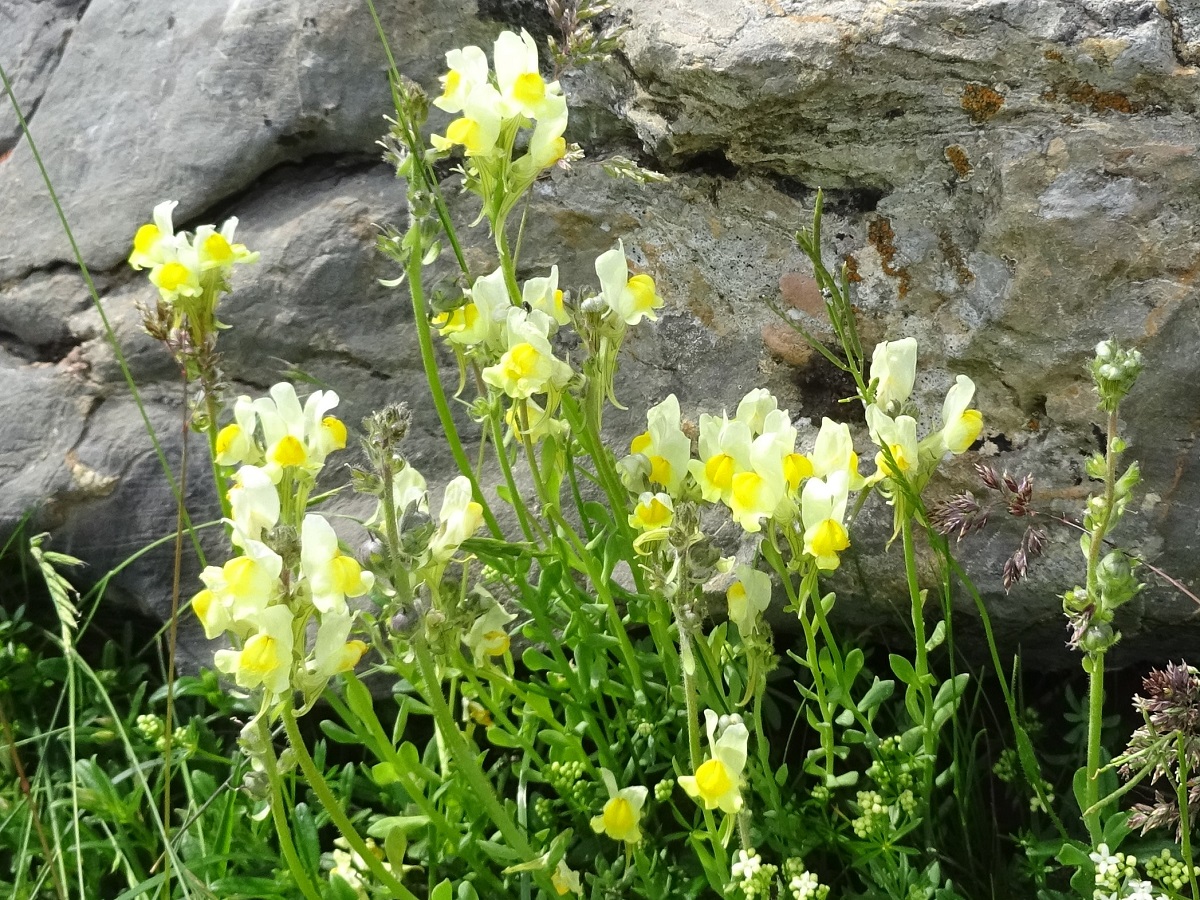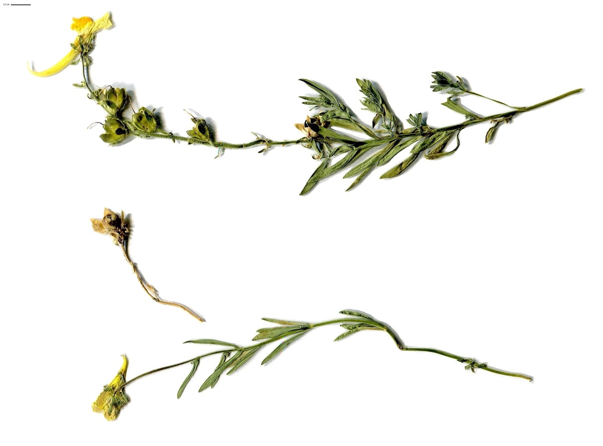 Th/Hc – 1-2 dm – Feuilles linéaires lancéolées fasciculées glauques – Grappe courte, corolle L de 1,5-2 cm jaune pâle, palais + foncé, éperon de L ≃ 1,5 cm très recourbé – Capsule ≤ calice