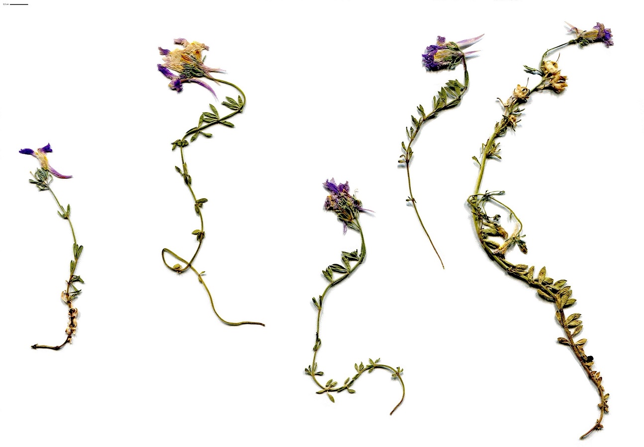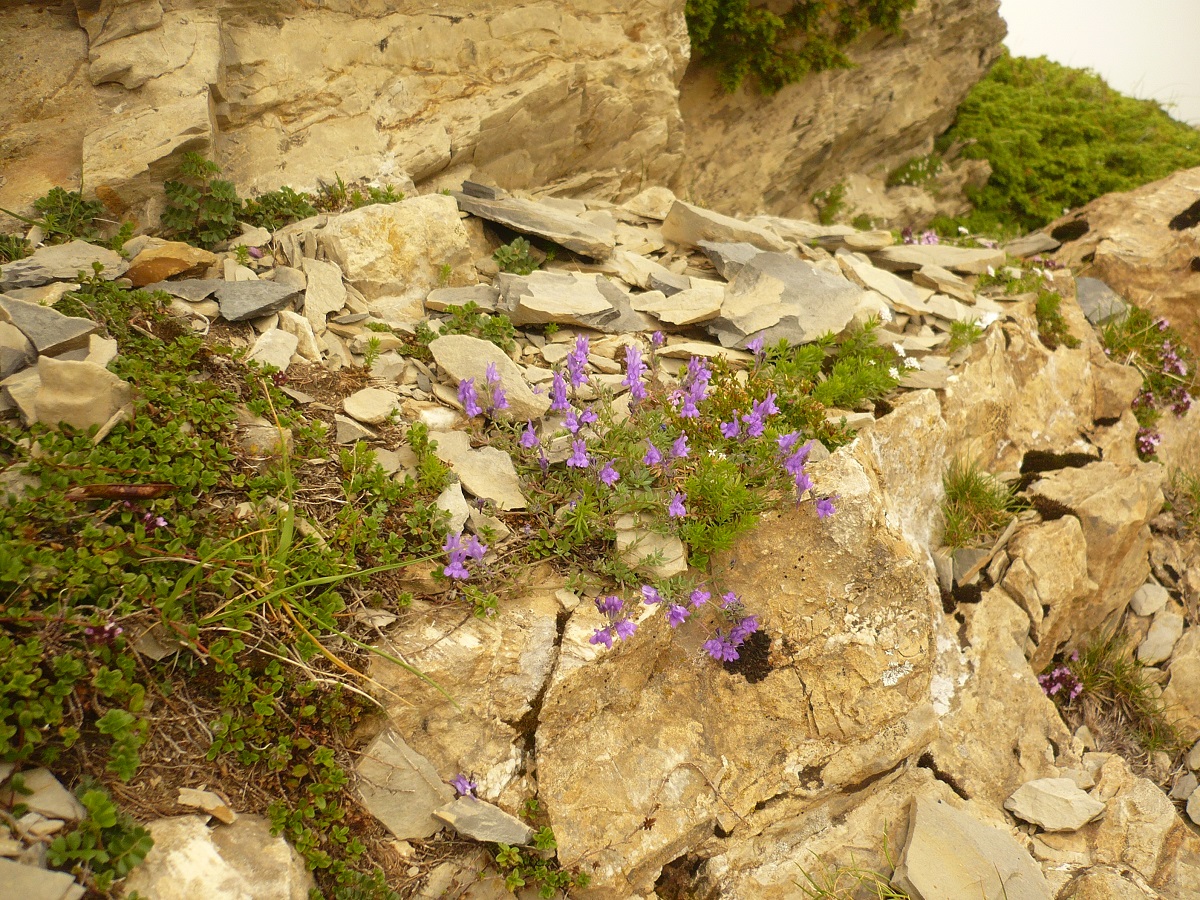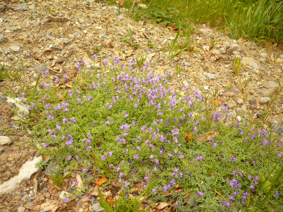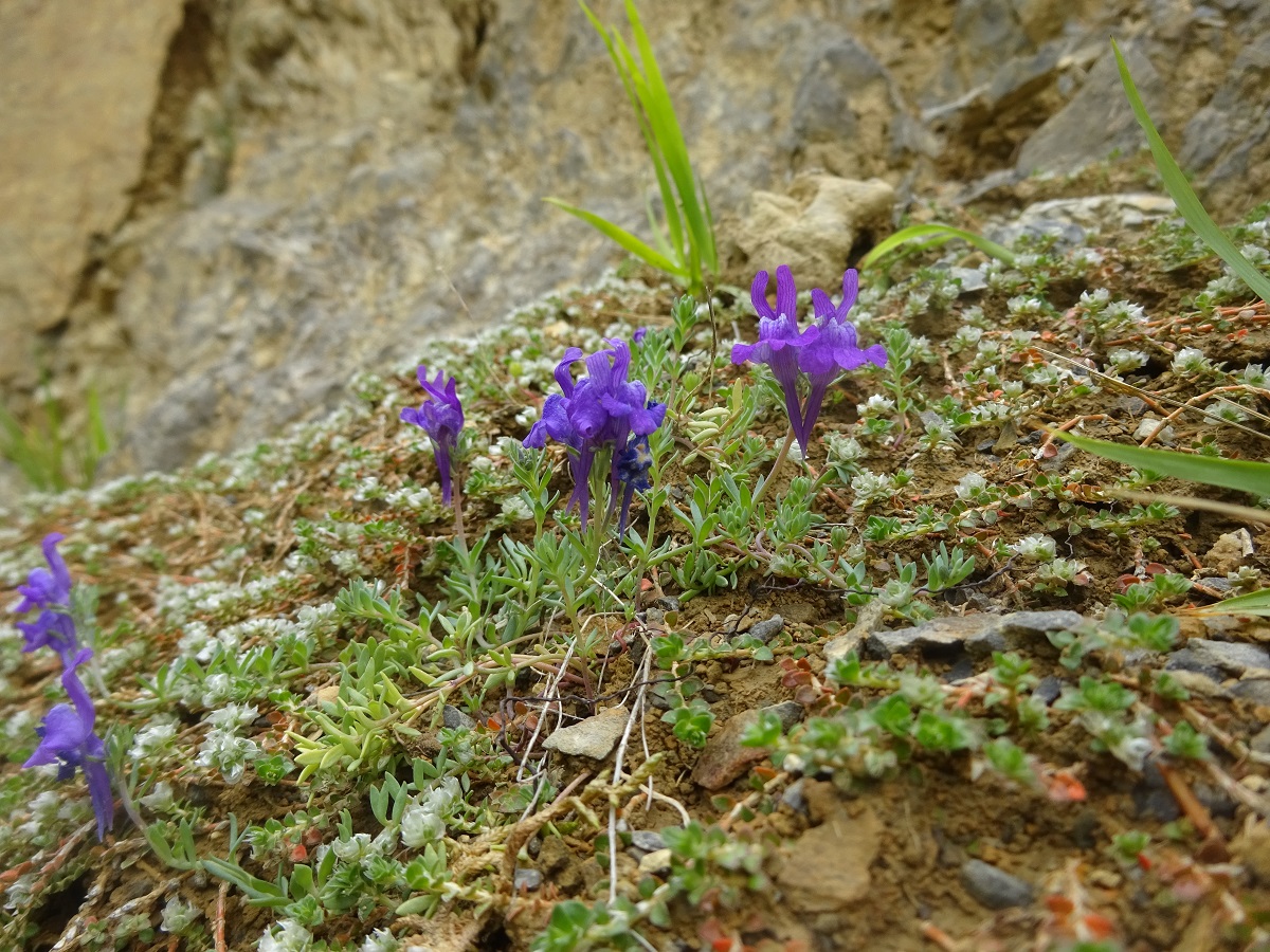 Th/Hc – 0,5-1,5 dm – Tige ± couchée, feuilles en alêne glauques verticillées, sessiles – Fleur de L ≃ 2 cm bleu violacé, palais orangé, éperon peu courbé – Capsule subglobuleuse