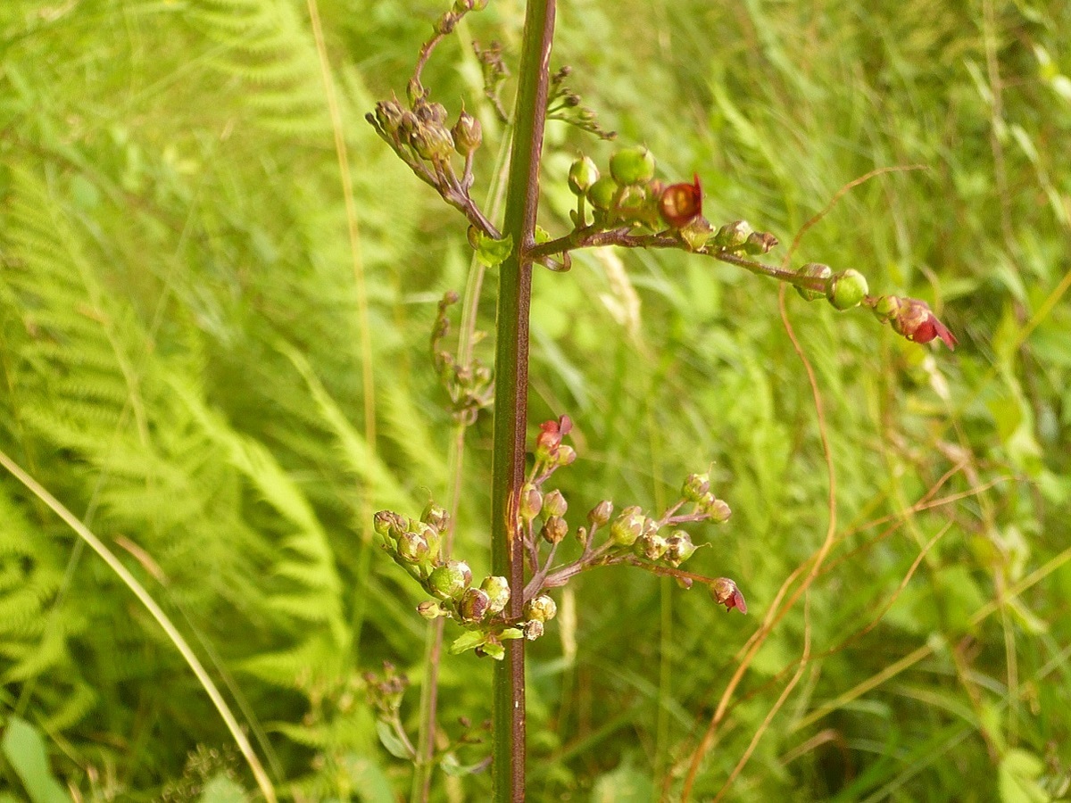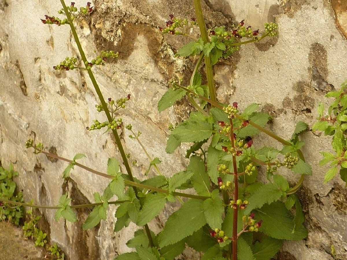 Hc – 5-15 dm – Tige ailée, feuilles opposées ovales obtuses dentées, lyrées – Fleurs de Ø ≃ 1 cm globuleuses brun pourpre, calice à marge scarieuse étroite, staminode + large que haut