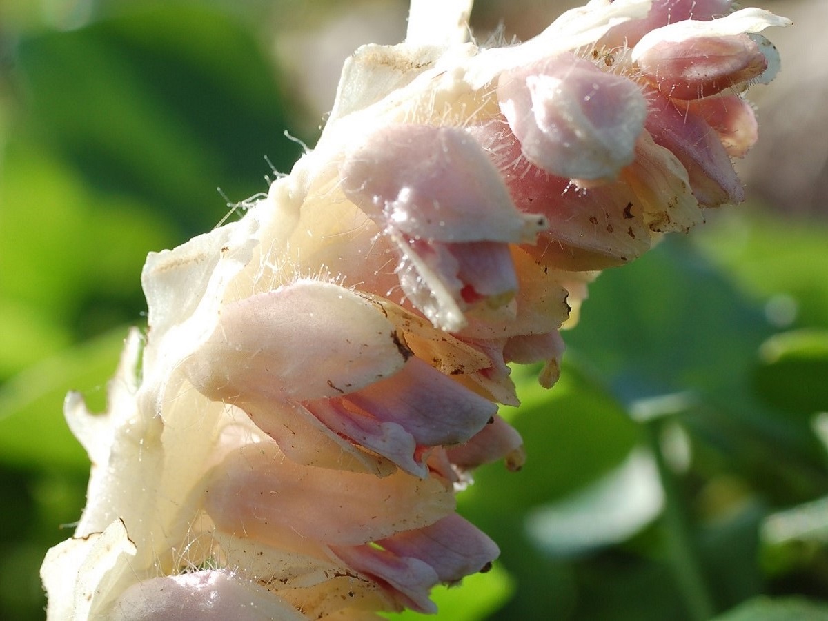 G à rhizome Par – 0,5-2,5 dm – Tige épaisse dressée, feuilles sessiles en écailles beiges – Grappe unilatérale, corolle de L ≃ 1,5 cm ± rosée, lèvres ± égales, calice de L ≃ 1 cm velu