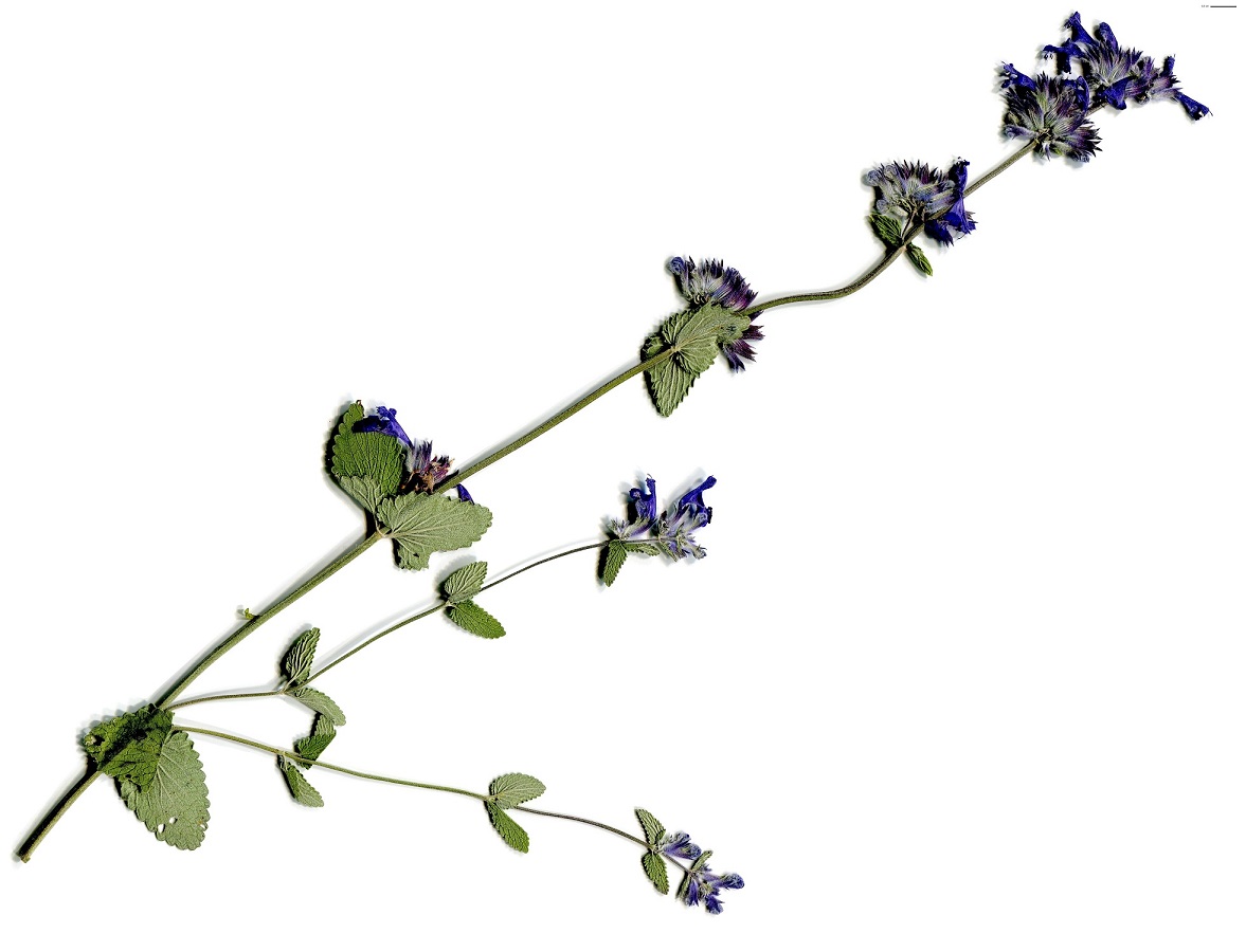Hc – 3-6 dm – Odorante, feuilles L de 2-3 cm ovales tronquées à cordées, ridées, crénelées, gris argenté, opposées, pétiolées – Verticillastres en épi très lâche, corolle bleu violet de L ≃ 1 cm