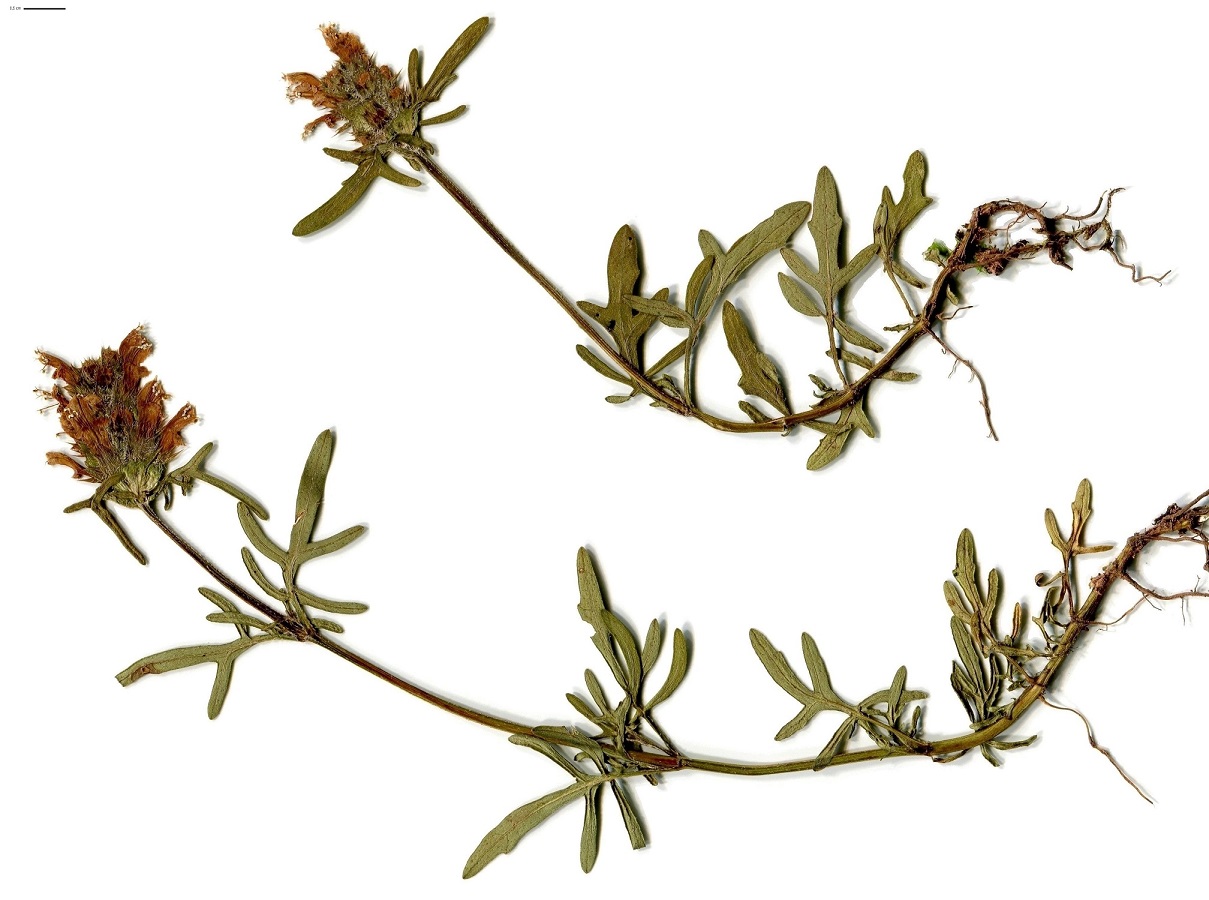 Hc – 1-3 dm – Feuilles ciliées L de 3-5 cm lyrées pennatifides opposées, pétiolées – Verticillastres en épi court compact, corolle bilabiée blanche L de 1-1,5 cm, lèvre > en casque