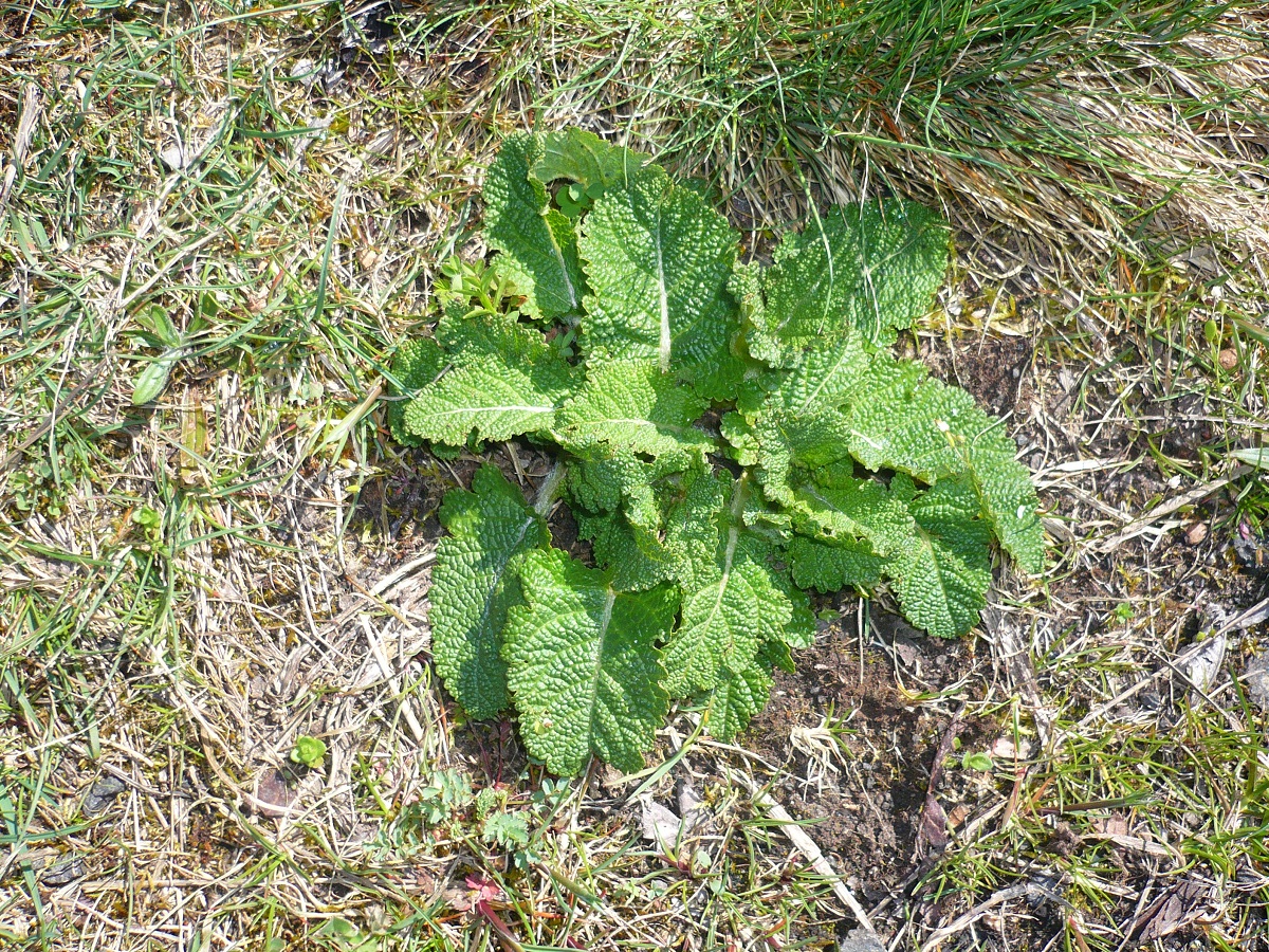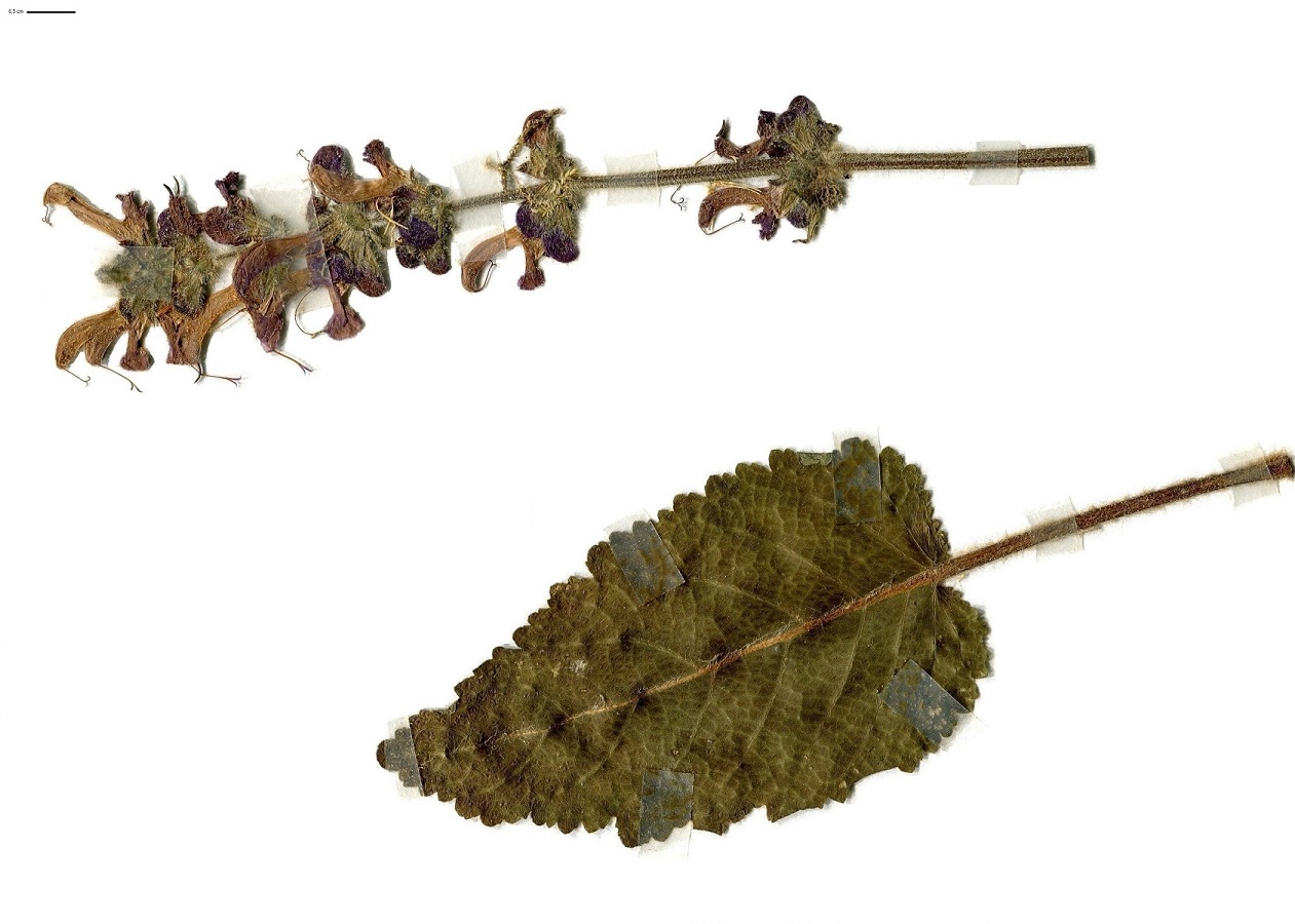 Hc – 4-8 dm – Feuilles L de 6-12 cm ovales cordées ± lobées crénelées dentées, ridées rugueuses, pétiolées – Corolle grande L de 2-3 cm bilabiée bleu violet, lèvre > falciforme, style exsert