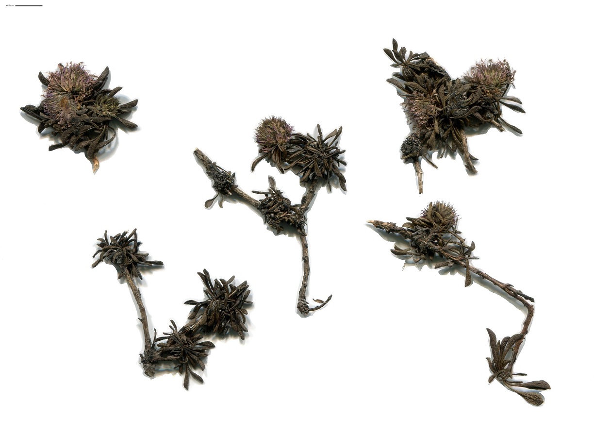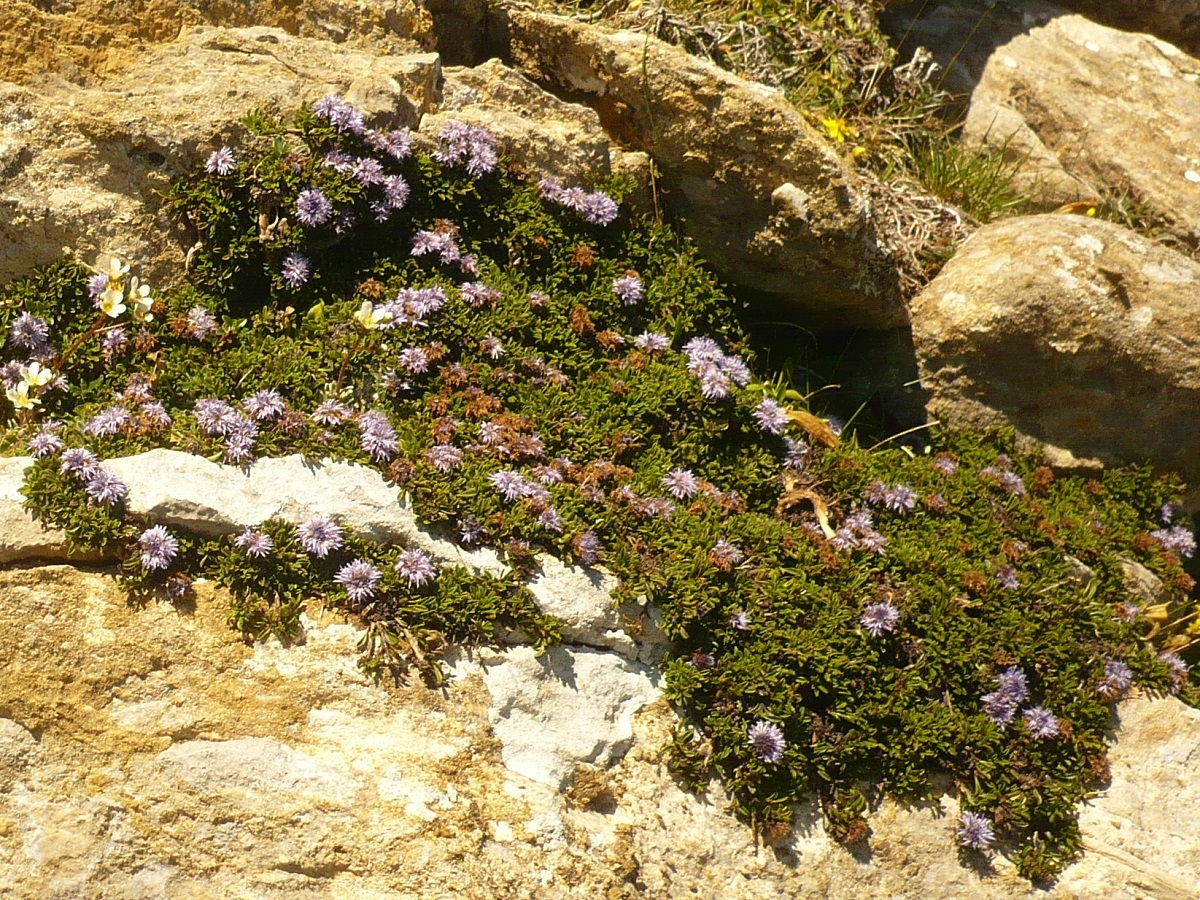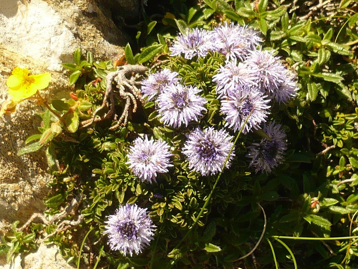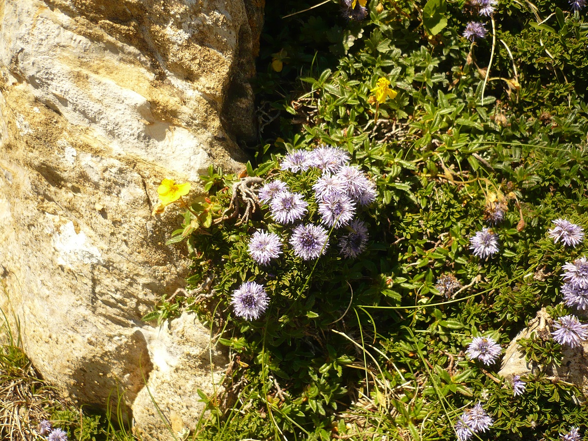 Ch – 0,1-0,5 dm – Prostrée, feuilles < spatulées ± canaliculées de L ≃ 1 cm, coriaces, pétiolées – Fleurs en tête bleue globuleuse de Ø ≃ 1 cm, velue, hampe striée à feuilles réduites