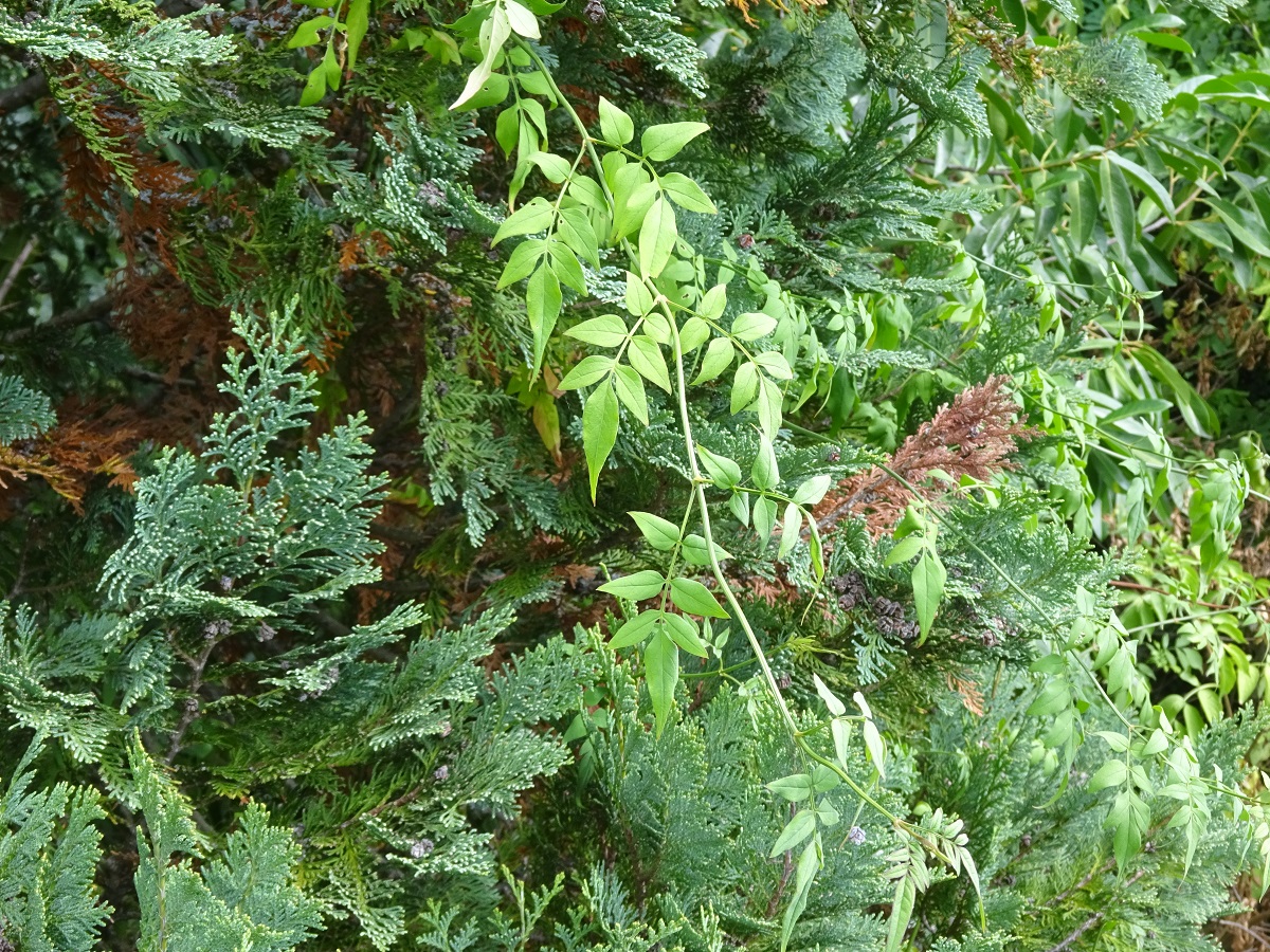 NPh L – 5-10 m – Feuilles à 5-9 folioles L de 1-6 cm ovales acuminées, opposées – Fleurs 2-10 blanches, odorantes corolle de Ø 20-25 mm à 4-5 lobes oblongs – Baie blanche stérile