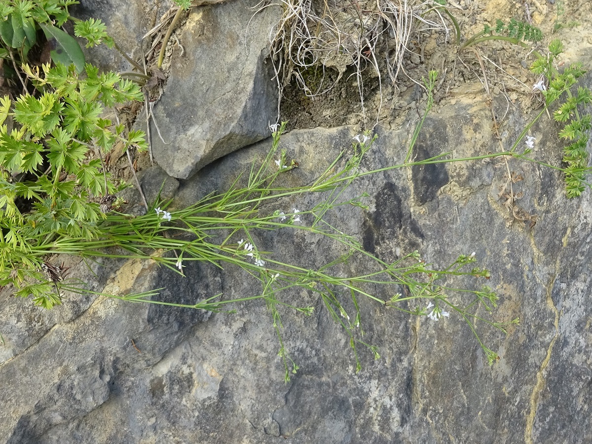 Hc/Ch – 2-5 dm – Tige grêle ± glauque, toutes les « feuilles » de L 1,5-2,5 cm, par 4, étroites, ± révolutées – Inflorescence lâche, corolle de Ø 2,5-3,5 mm rose en entonnoir – Fruit glabre