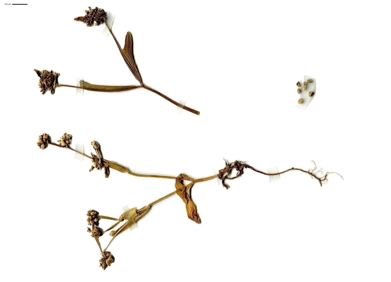 Th – 1-2 dm – Feuilles larges spatulées, bractées oblongues – Corolle bleutée en trompette, à 5 lobes obtus – Fruit lenticulaire de Ø 2-2,5 mm, à loges stériles bombées, calice à peu près nul
