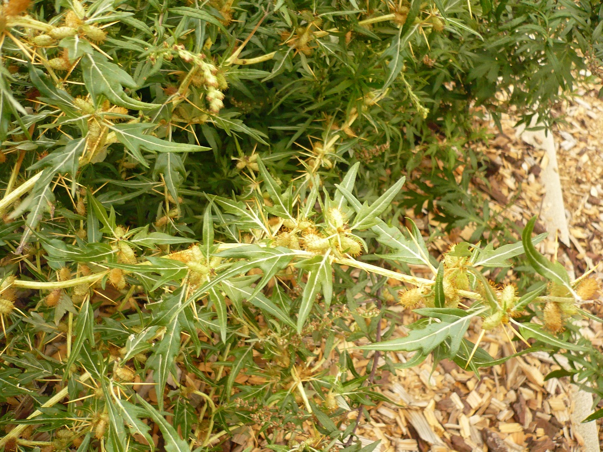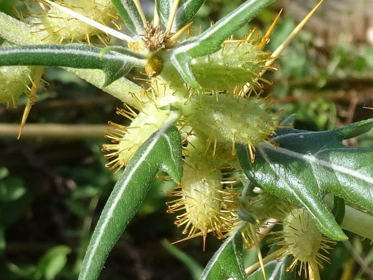 Th – 4-8 dm – Épines jaunes, feuilles discolores lancéolées tripartites à court pétiole – Capitules ♂ et ♀ – «Fruit» ovoïde L de 1-1,2 cm, aiguillons droits à apex crochu, becs ± absents