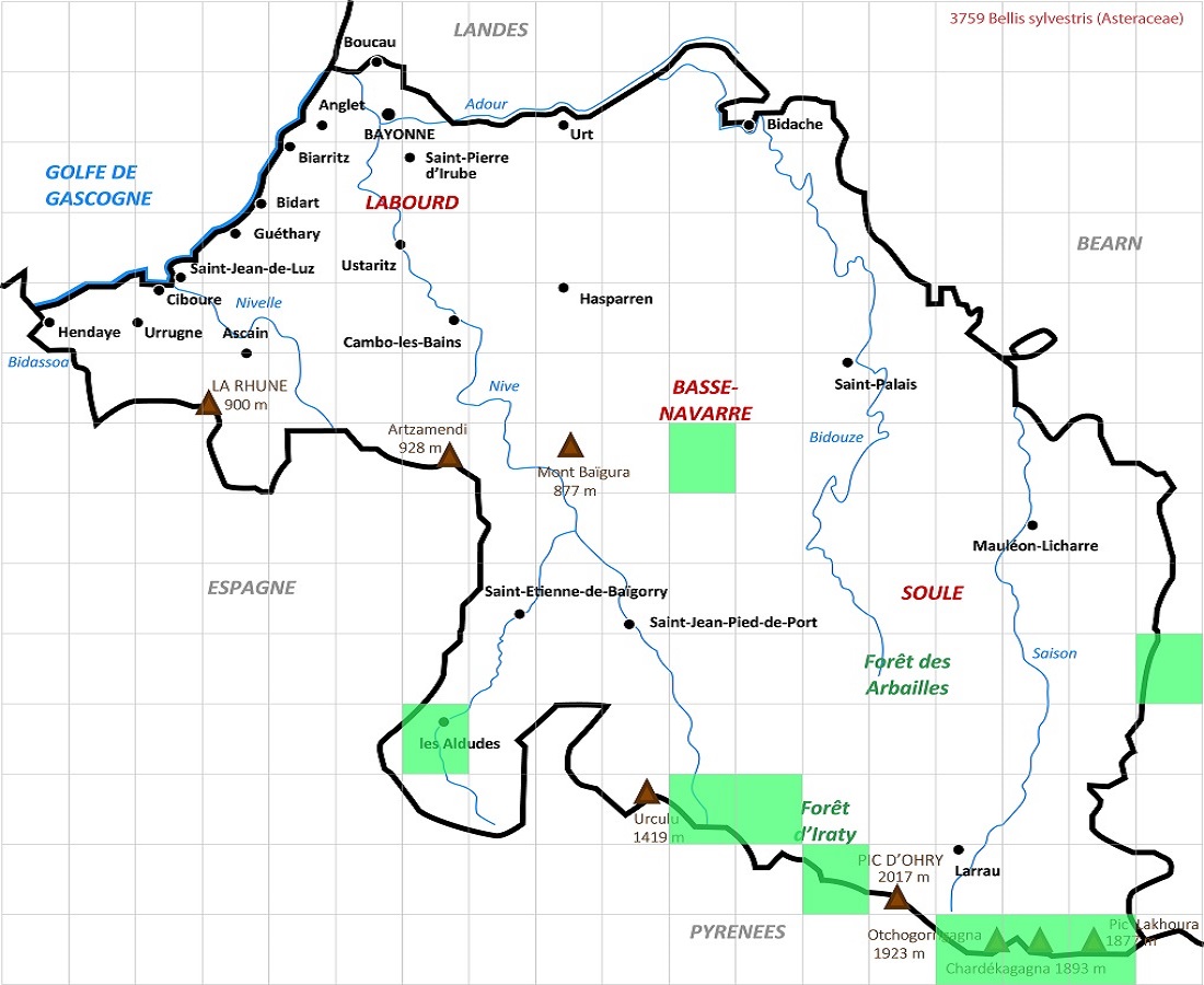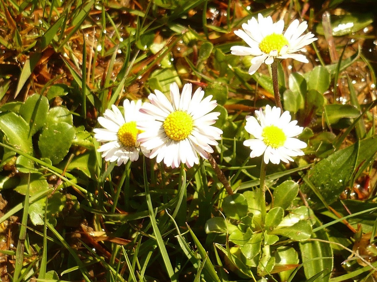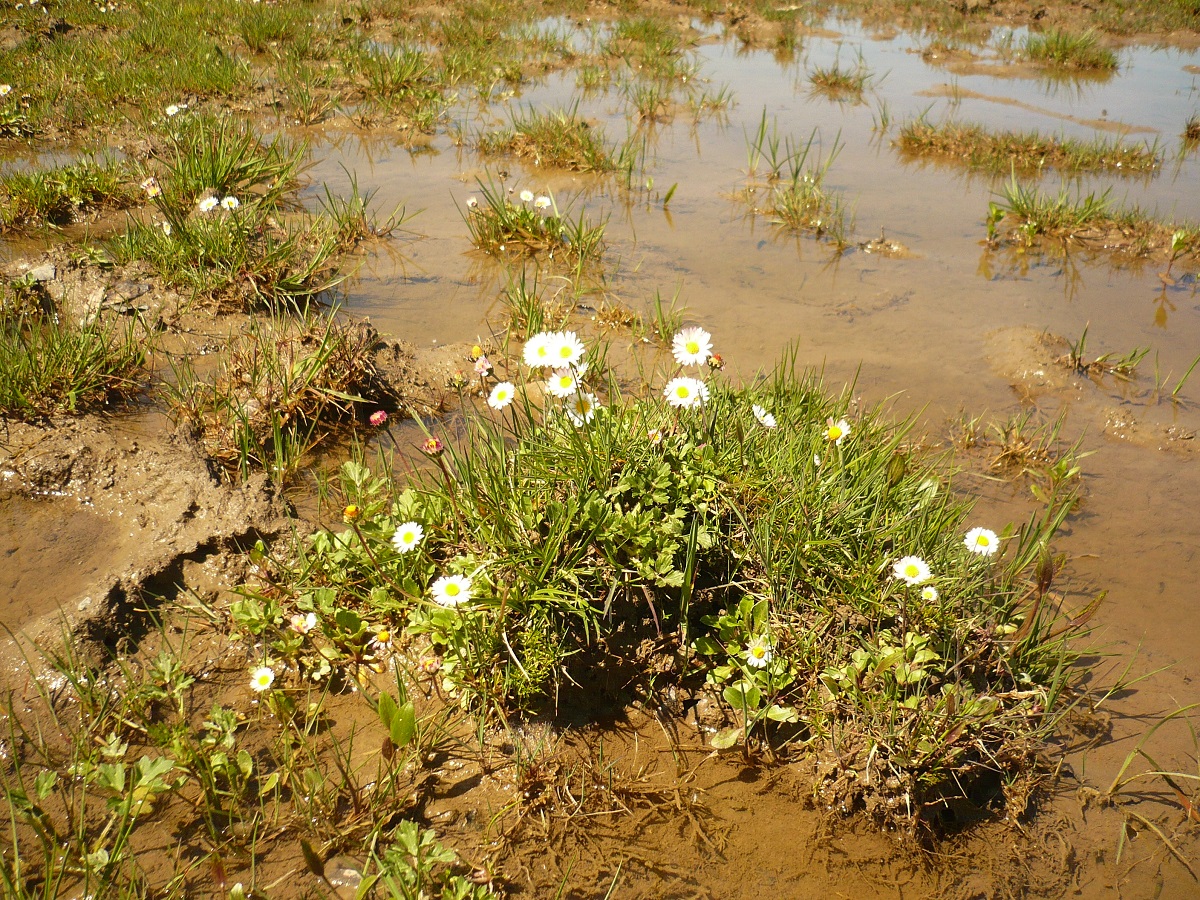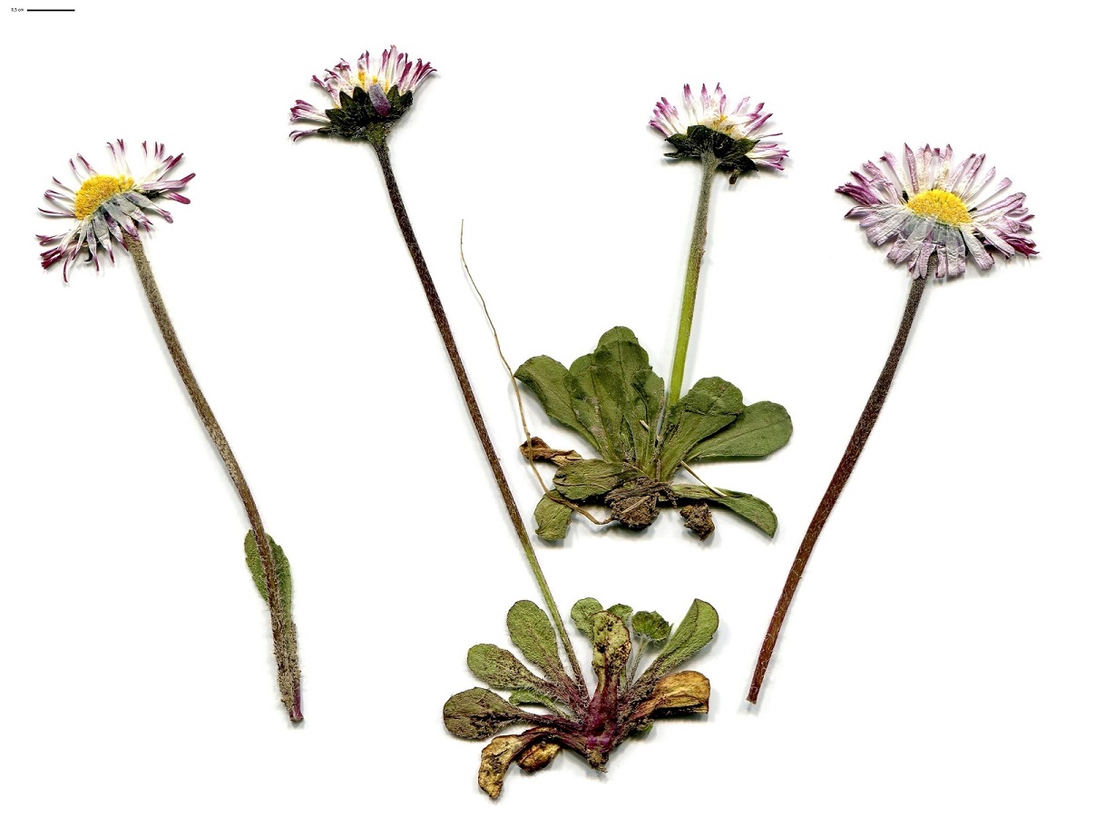 Hc – 1-2 dm – Feuilles spatulées étalées en rosette, pétiole large – Capitule de Ø 2-3 cm, ½-ligules blanches, fleurons en tube jaunes de L > 2 mm, bractées L de 7-12 mm aiguës