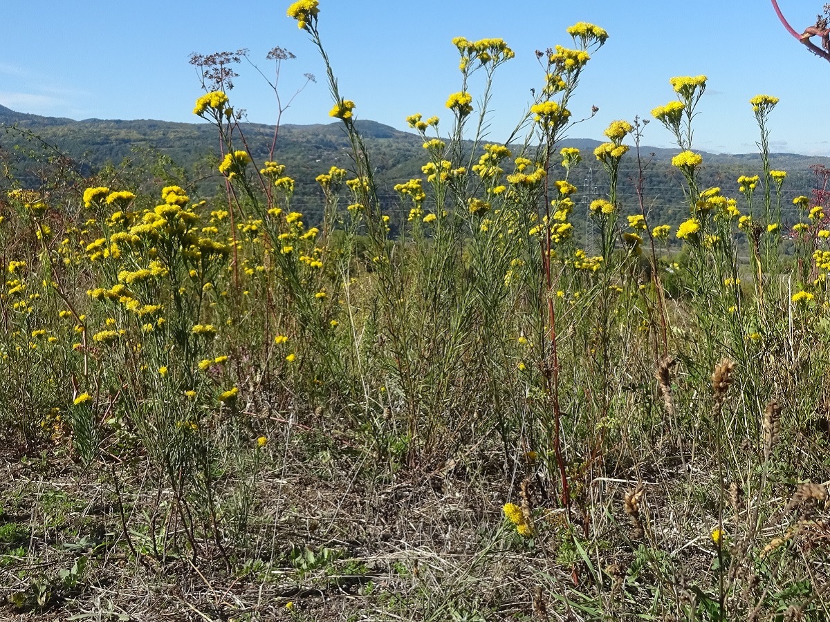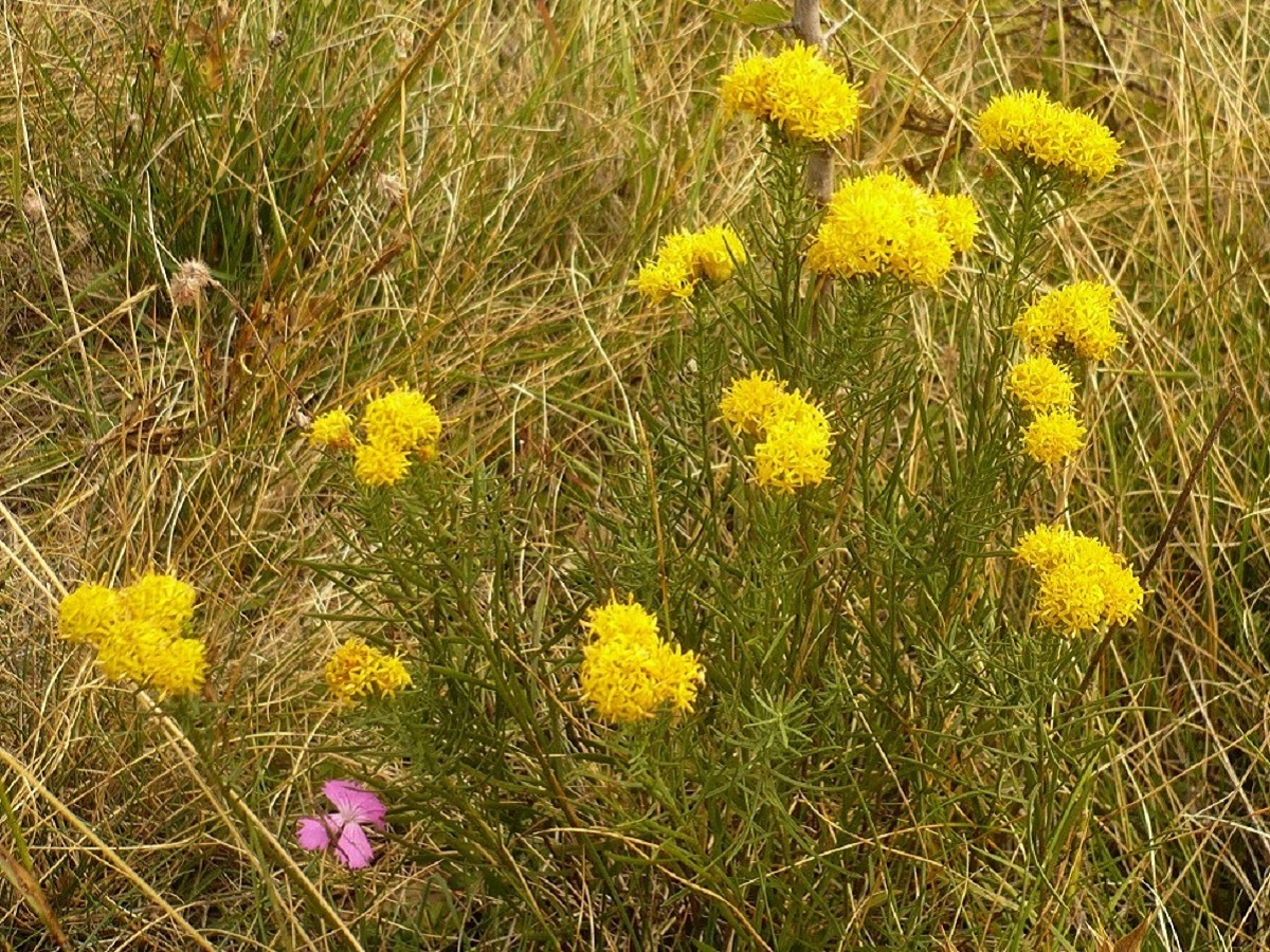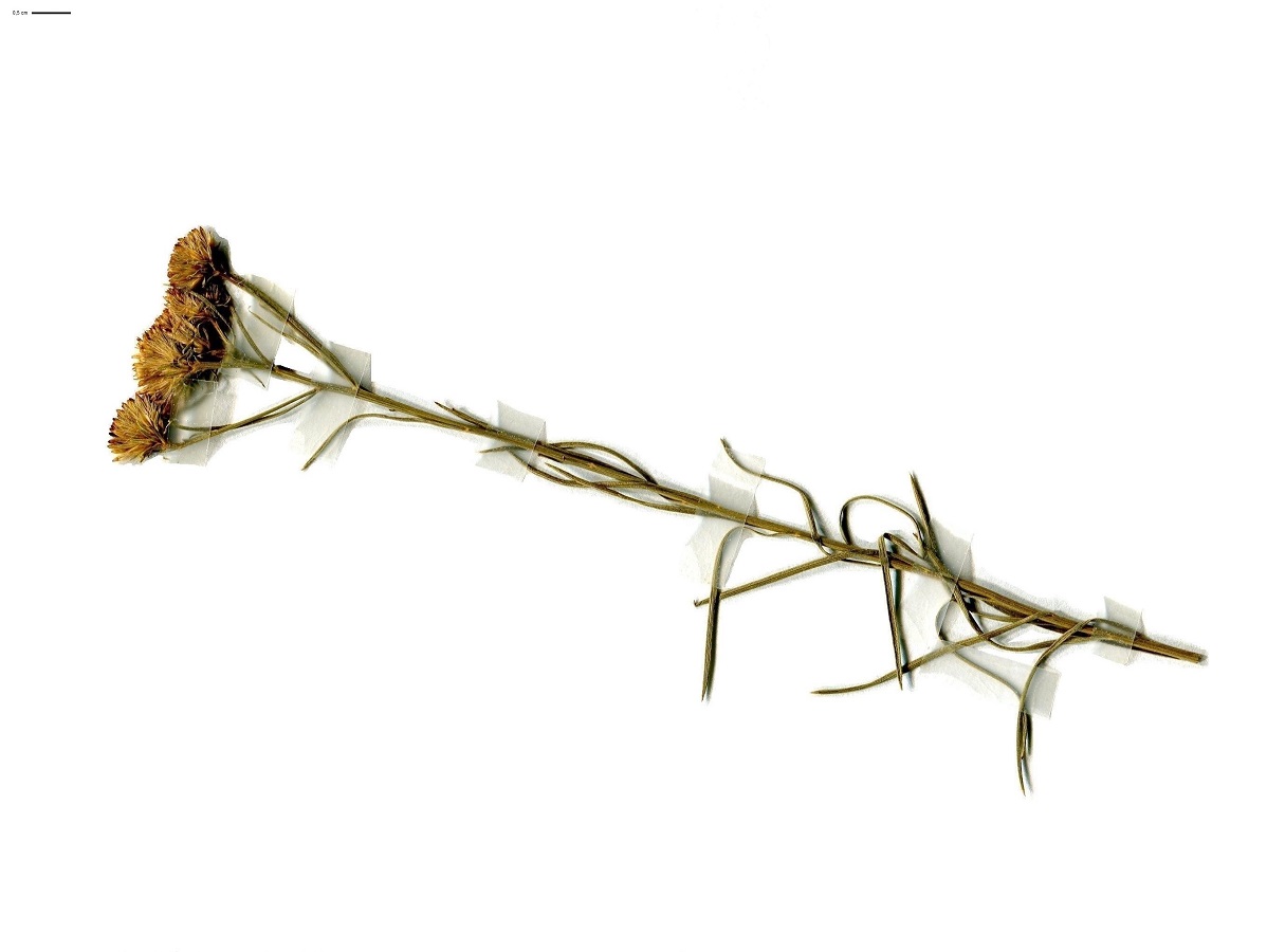Hc – 2-5 dm – Feuilles glabres serrées linéaires, sessiles – Capitules de Ø ≃ 1 cm en corymbe, fleurons en tube jaunes, bractées internes scarieuses acuminées – Pappus à soies inégales