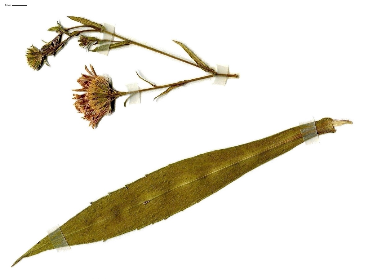 Hc – 4-8 dm – Tige ± glabre, feuilles ovales lancéolées peu dentées, les > auriculées – Capitules de Ø 2,5-3 cm, ½-ligules bleu violet ≃ 2 mm de large, bractées vertes assez larges aiguës