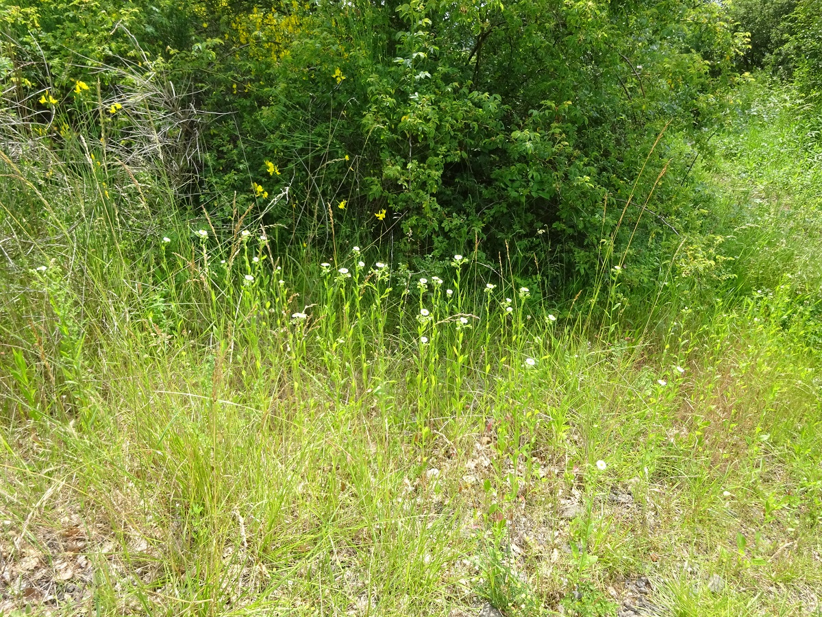 Hc – 6-12 dm – Tige dressée à poils recourbés, feuilles < ovales ± entières, les > lancéolées – Capitules de Ø 1,5-2 cm, hémiligules blanches de L ≃ 6 mm ≃ au Ø du disque jaune