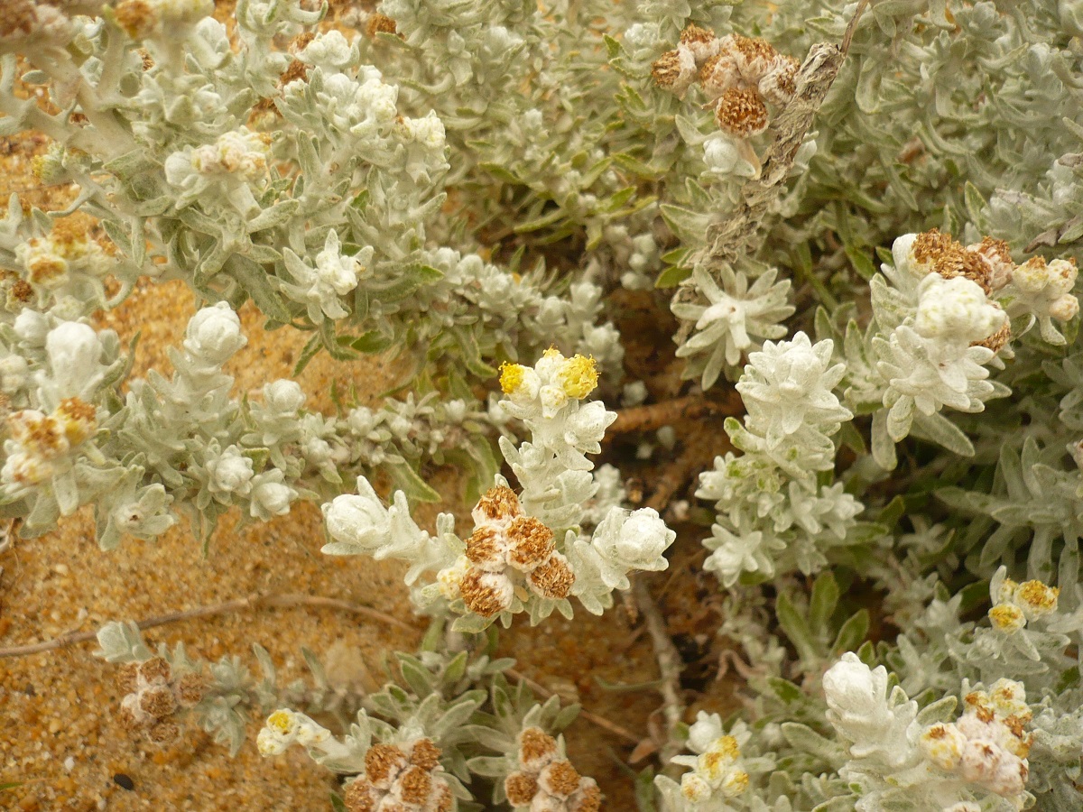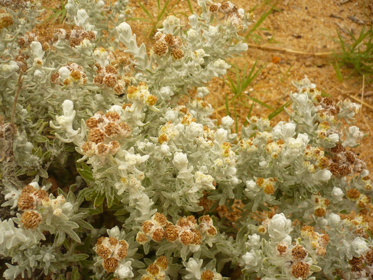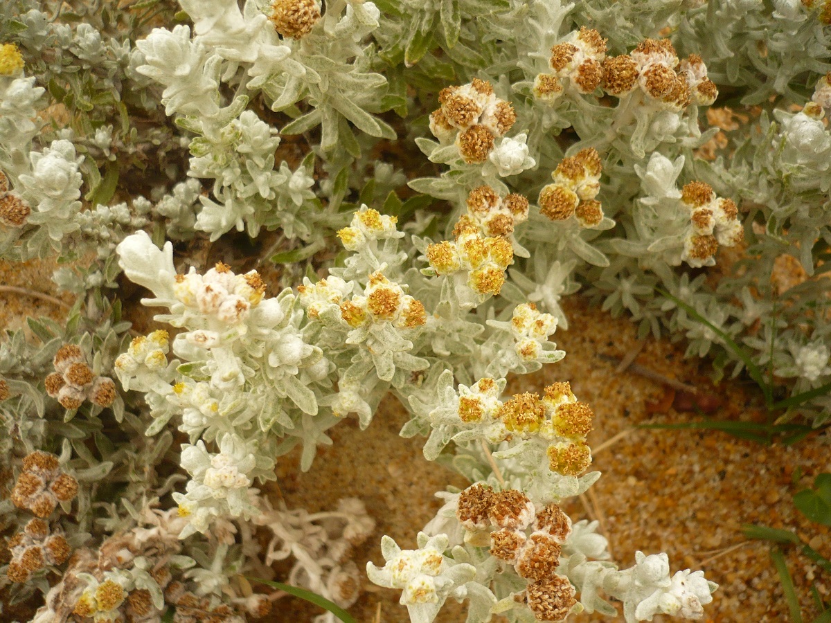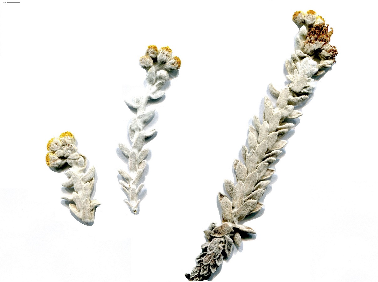 Hc – 1-4 dm – Blanche laineuse, feuilles L de 5-15 mm épaisses oblongues spatulées sessiles – Capitules de Ø 7-10 mm globuleux peu nombreux en têtes terminales, fleurons jaunes
