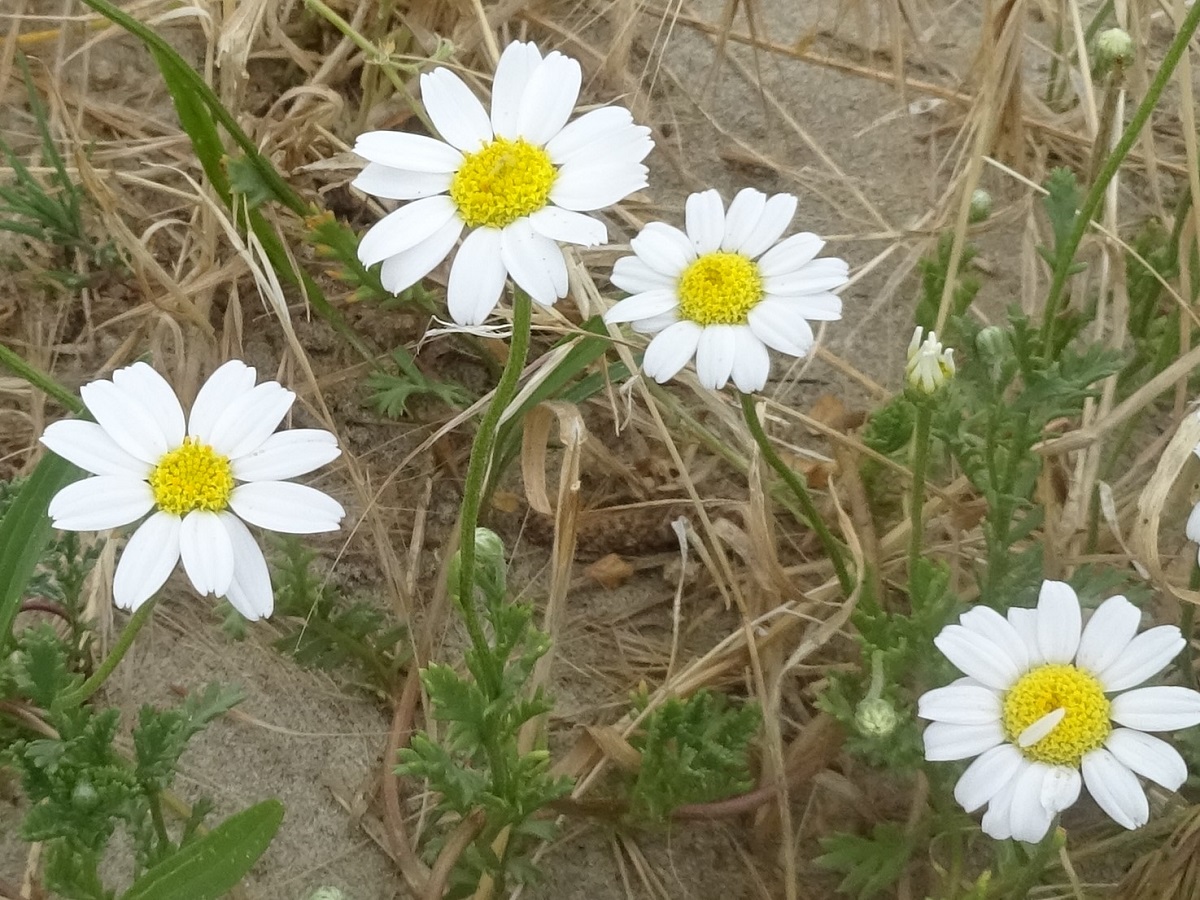 Th/Hc – 2-6 dm – Plante ± étalée, feuilles charnues divisées en segments épais – Capitule inodore de Ø 2,5-4,5 cm, à fleurons jaunes, ½-ligules blanches étalées, pédoncule renflé