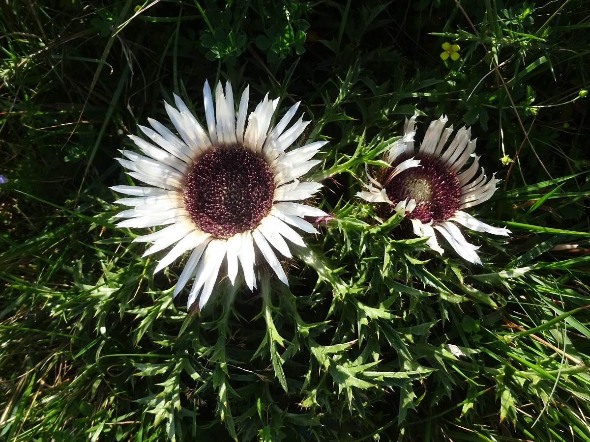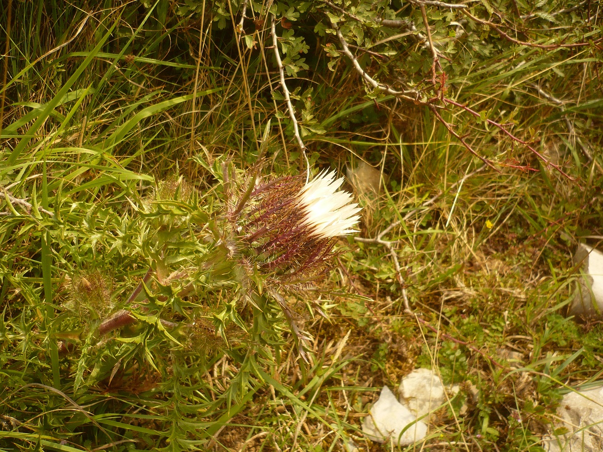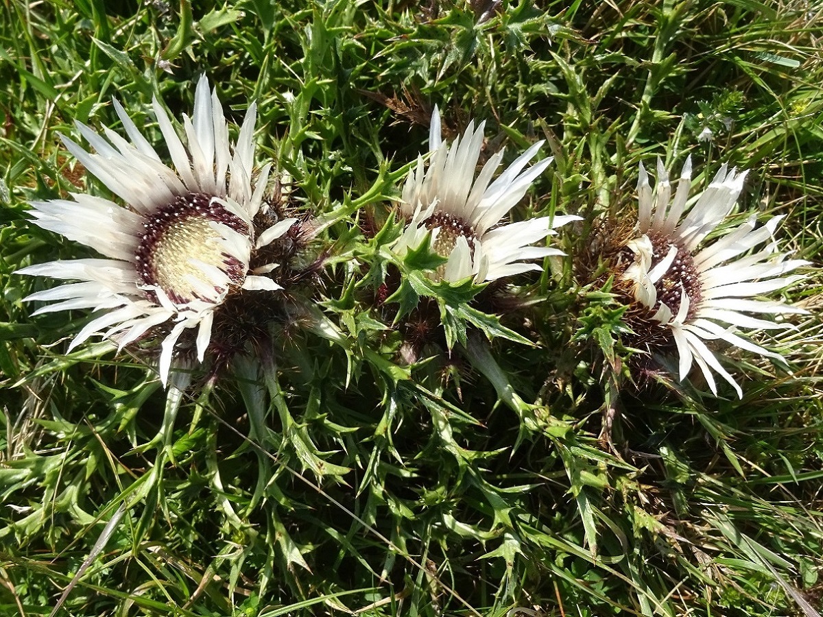 Hc – 0,5-3 dm – ± Acaule, feuilles à lobes étroits aigus très épineux, ~ glabres – Capitules de Ø 4-6 cm, fleurons blancs à pourpre foncé, bractées internes de L ≃ 4 cm linéaires blanc argenté