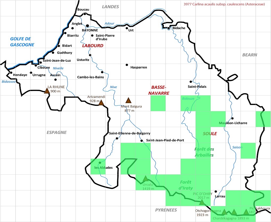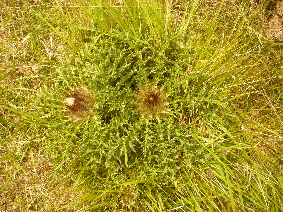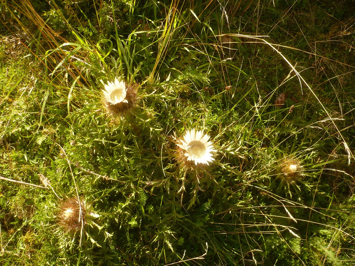 Hc – 0,5-3 dm – ± Acaule, feuilles à lobes étroits aigus très épineux, ~ glabres – Capitules de Ø 4-6 cm, fleurons blancs à pourpre foncé, bractées internes de L ≃ 4 cm linéaires blanc argenté