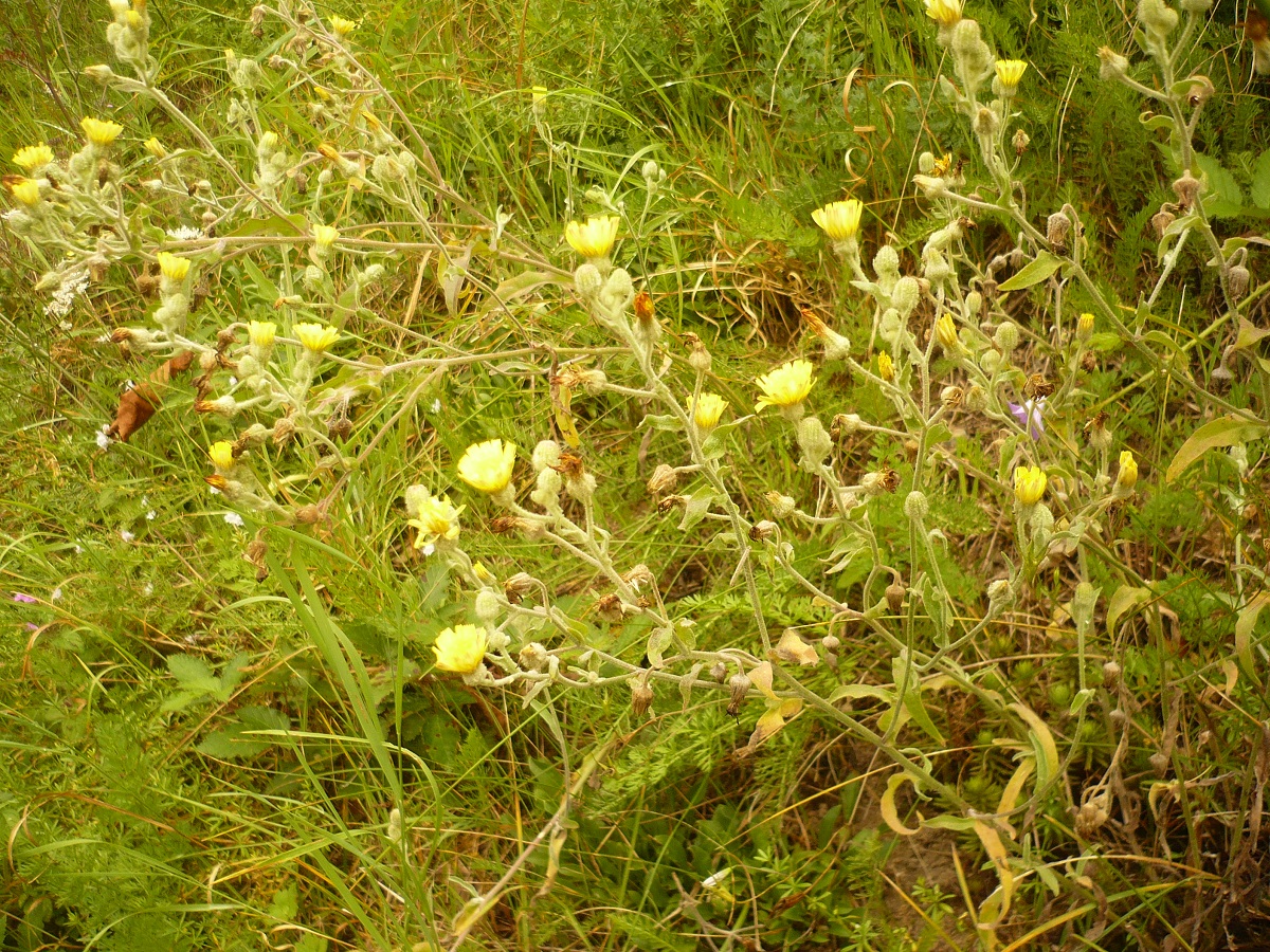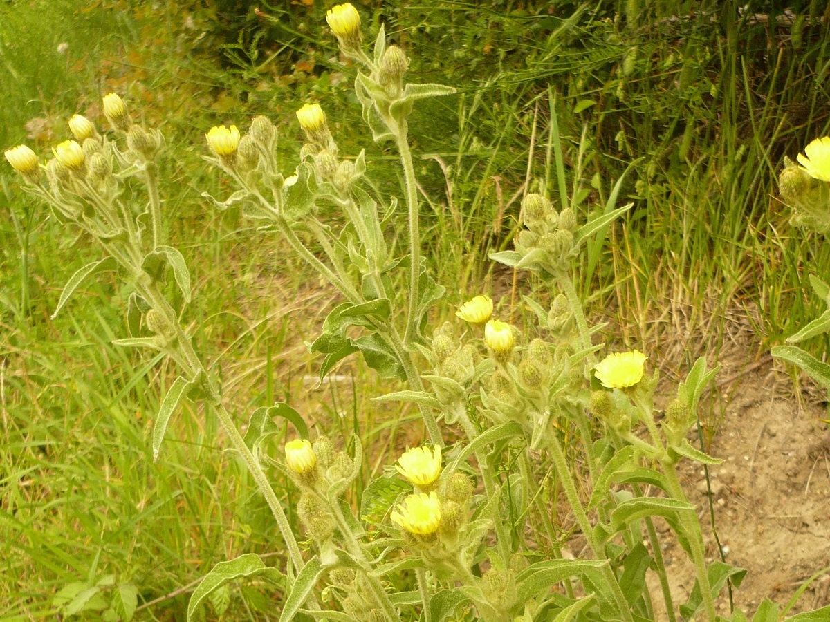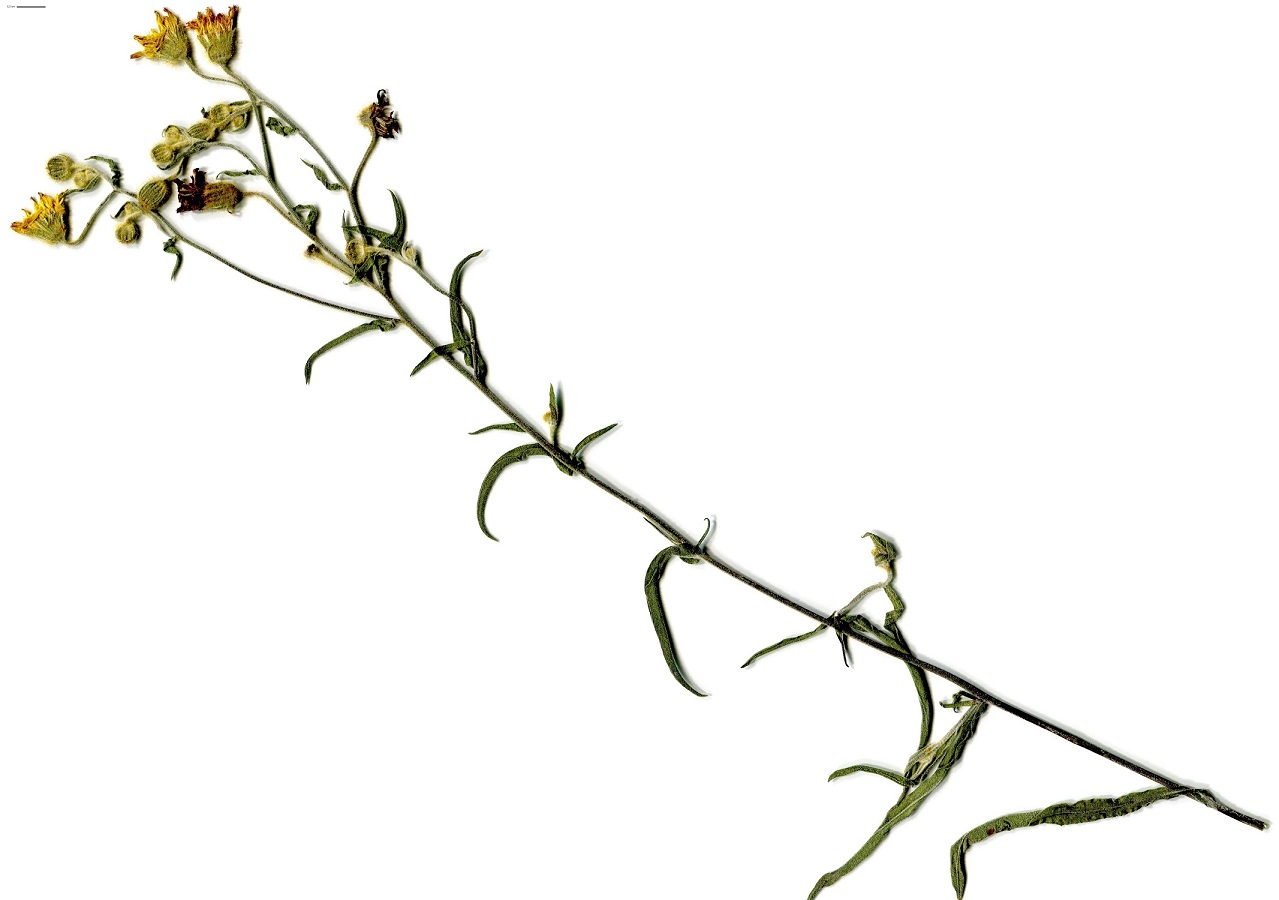 Th/Hc – 3-6 dm – Plante blanchâtre, feuilles lancéolées entières ou dentées – Capitules de Ø 12-15 mm en corymbe, ligules jaune soufre, bractées linéaires lancéolées glanduleuses