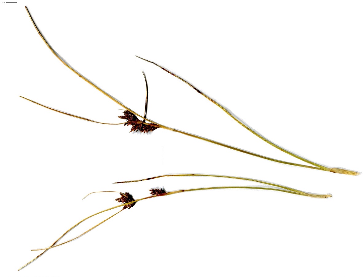 Hc – 2-5 dm – Tige et feuilles cylindriques, raides – Inflorescence brune, 1 épi > ♂ fin, 2-3 épis < ♀ groupés, 3 stigmates, bractée < très longue – Utricule de L ≃ 4 mm, ventru, nervé, bec bifide