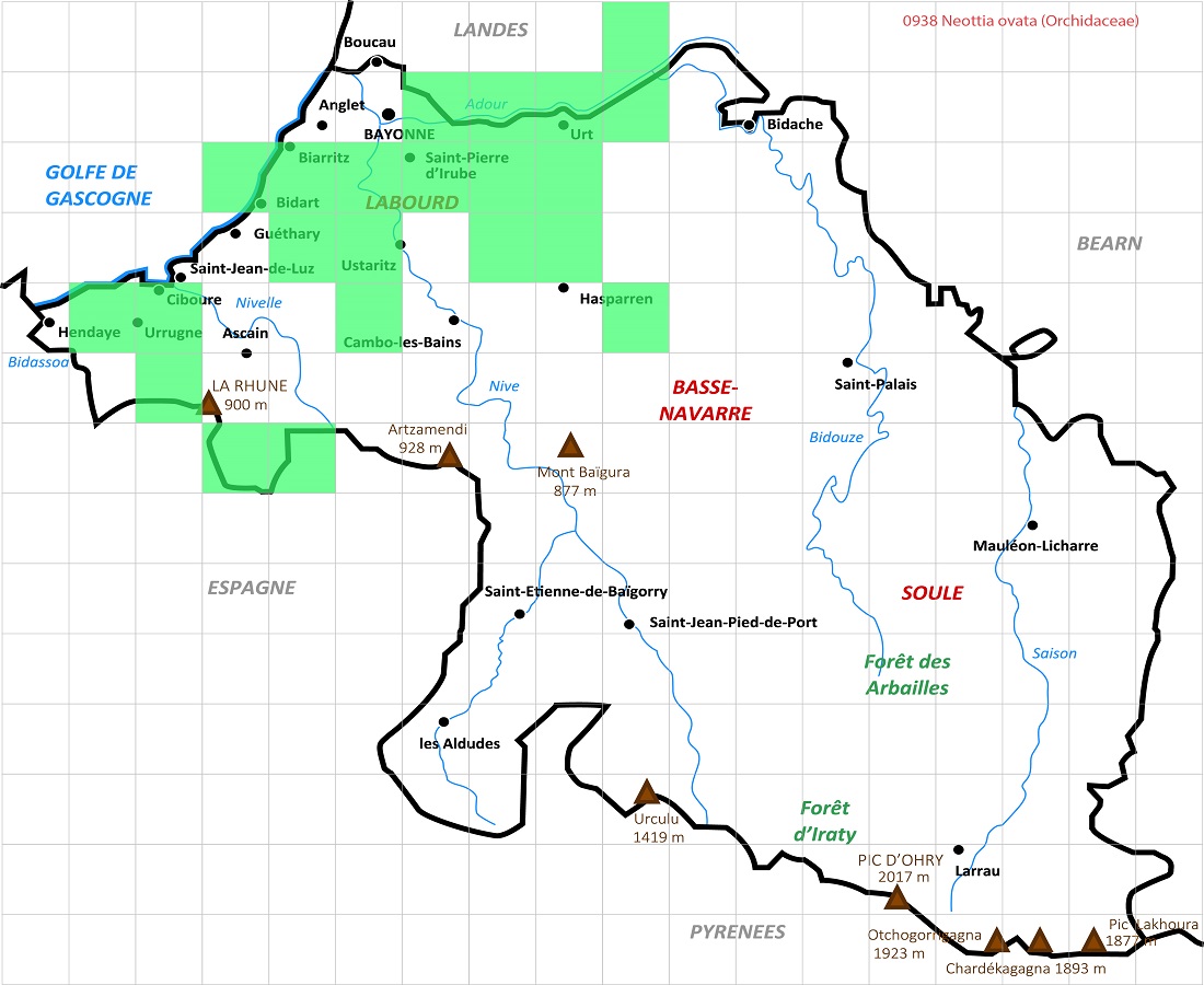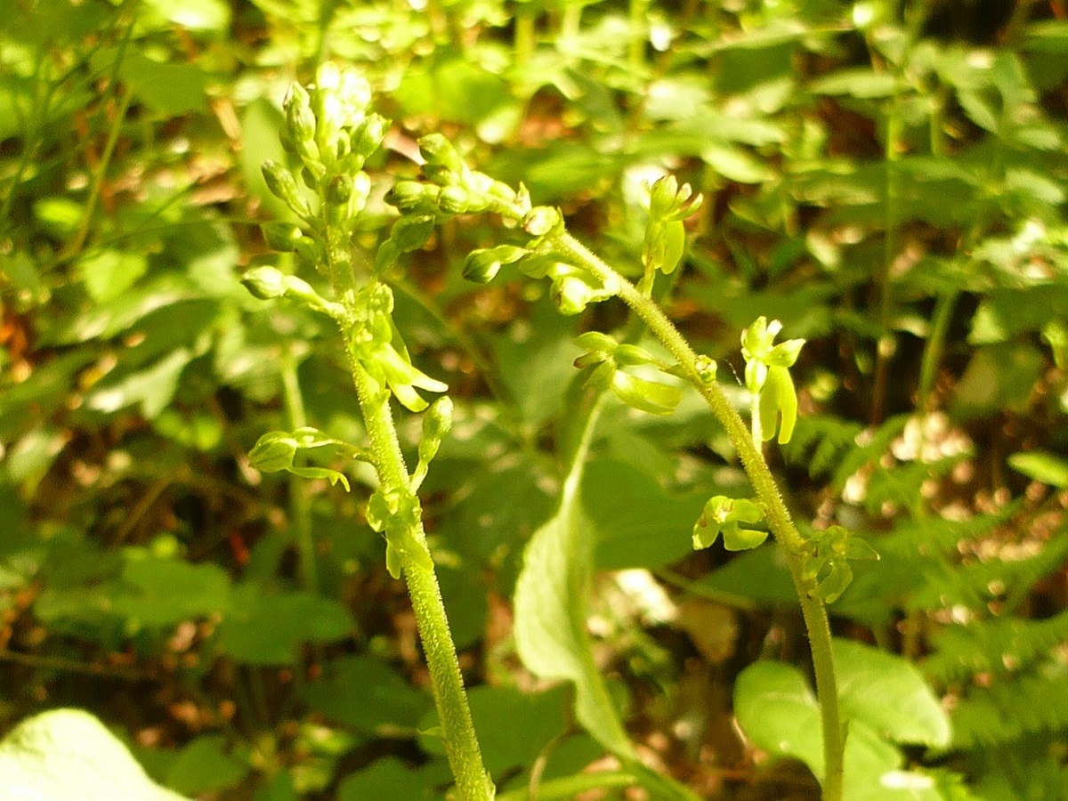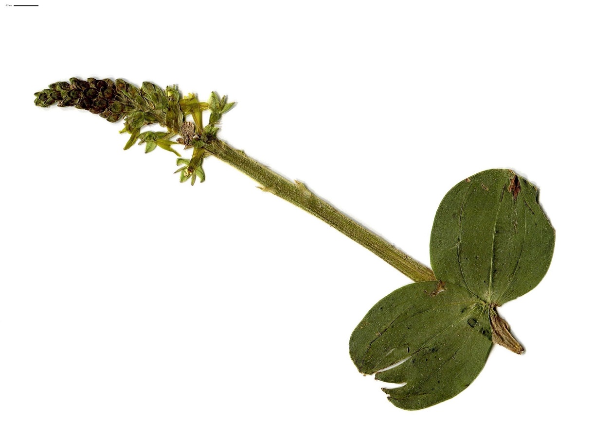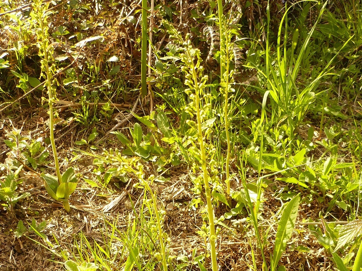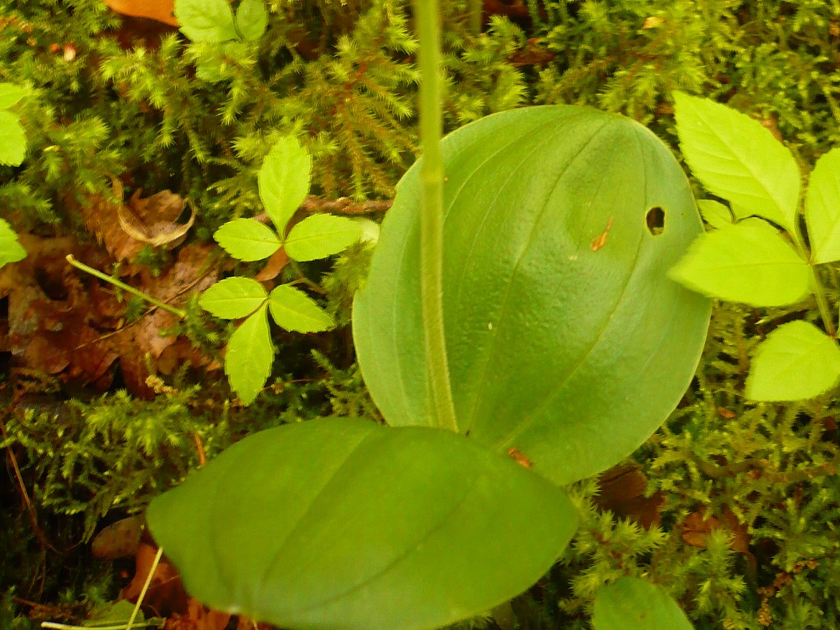 G à rhizome – 2-6 dm – 2 Feuilles largement ovales, presque basales et opposées – Grappe étirée de petites fleurs à labelle L de 7-15 mm vert-jaunâtre bilobé, à tépales verdâtres