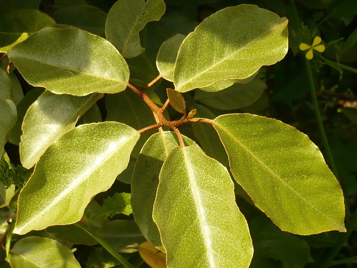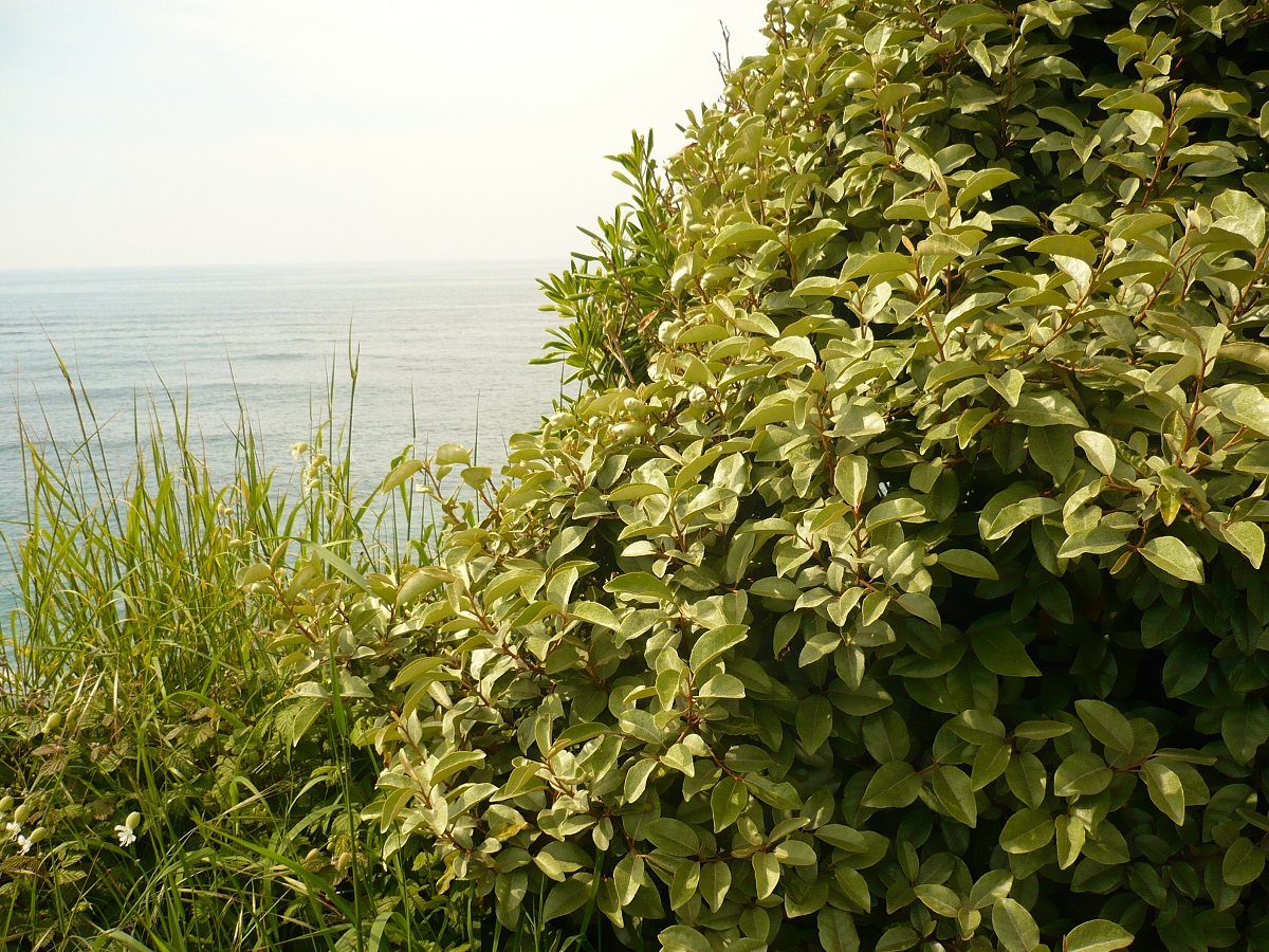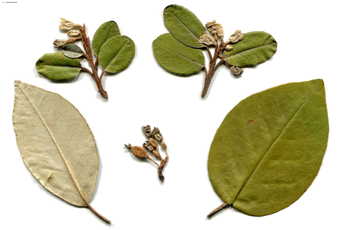Ch/NPh – 1-2 m – Feuilles ovales, argentées à rouille au revers, coriaces, persistantes – Fleurs odorantes blanc crème, en clochette à 4 lobes – Fruit ellipsoïde orange, pendant