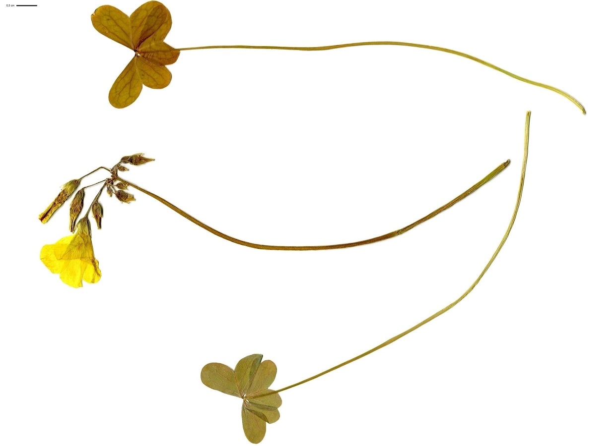 Hc/G – 1-2 dm – Plante acaule, feuilles à 3 folioles obcordées, à long pétiole – Fleurs grandes de Ø 2-2,5 cm à 5 pétales jaunes, en ombelle à long pédoncule – Capsule oblongue velue