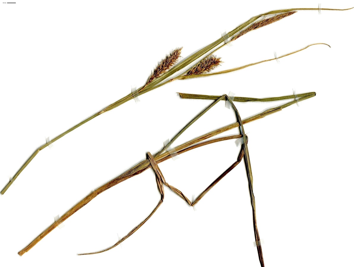 Hc/G à rhizome – 4-10 dm – Tige trigone et feuilles vertes scabres – 2-3 Épis > ♂ fins bruns, 2-3 épis < ♀ volumineux, 3 stigmates – Utricules bombés de L ≃ 7 mm, à long bec évasé