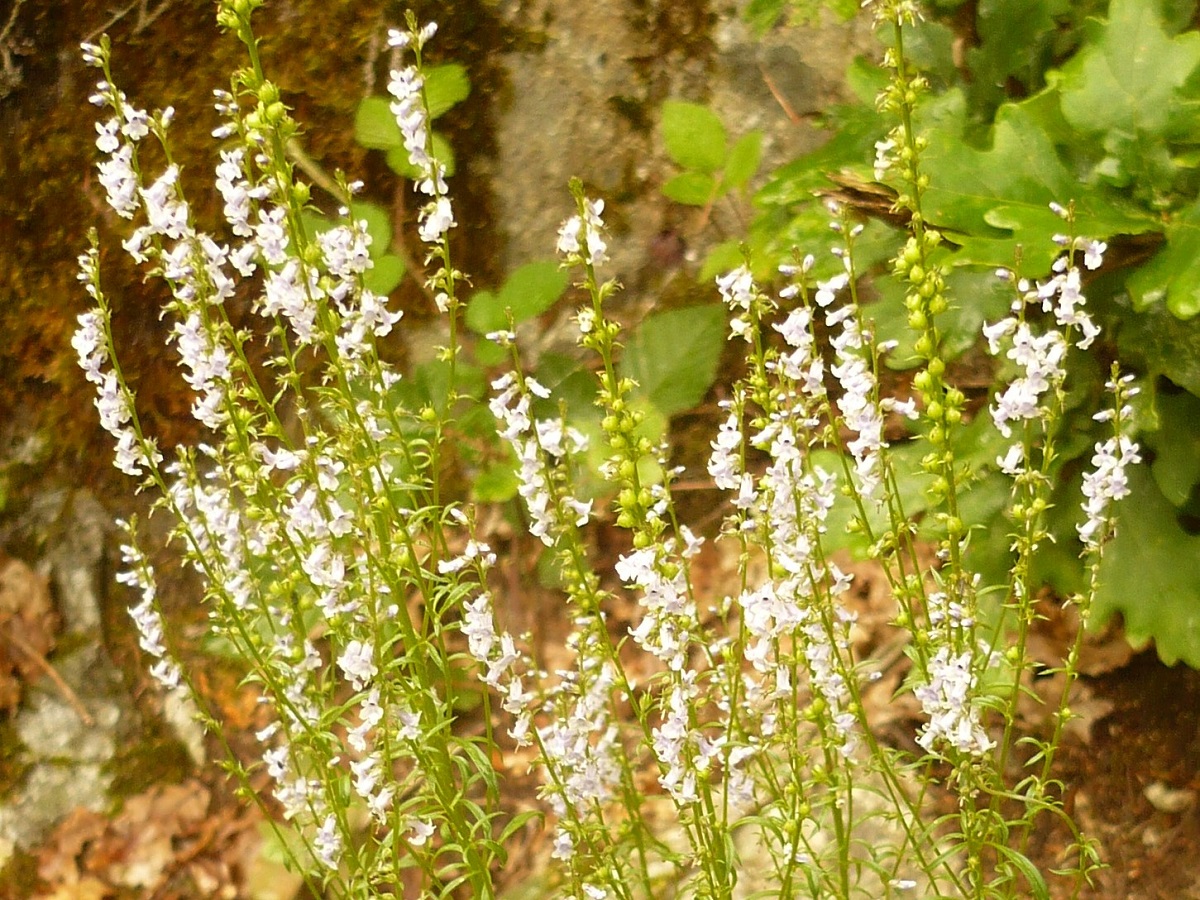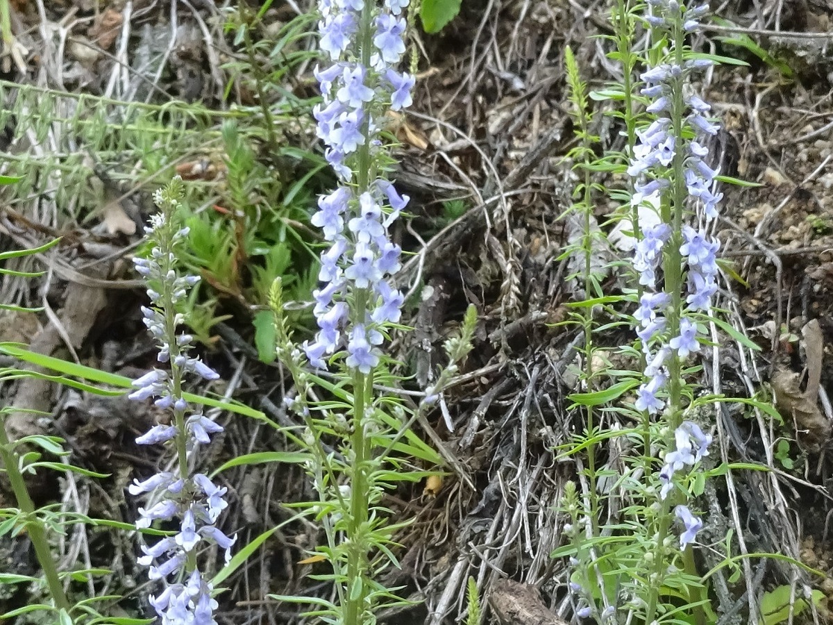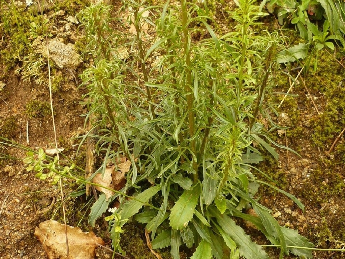 Hc – 2-8 dm – Feuilles < en rosette obovales spatulées dentées – Grappe fine étirée, corolle L de 4-5 mm bleu clair en tube évasé à 5 lobes, éperon recourbé en avant – Capsule sphérique