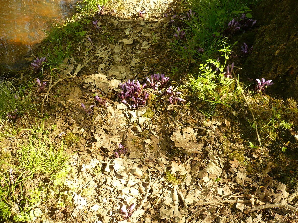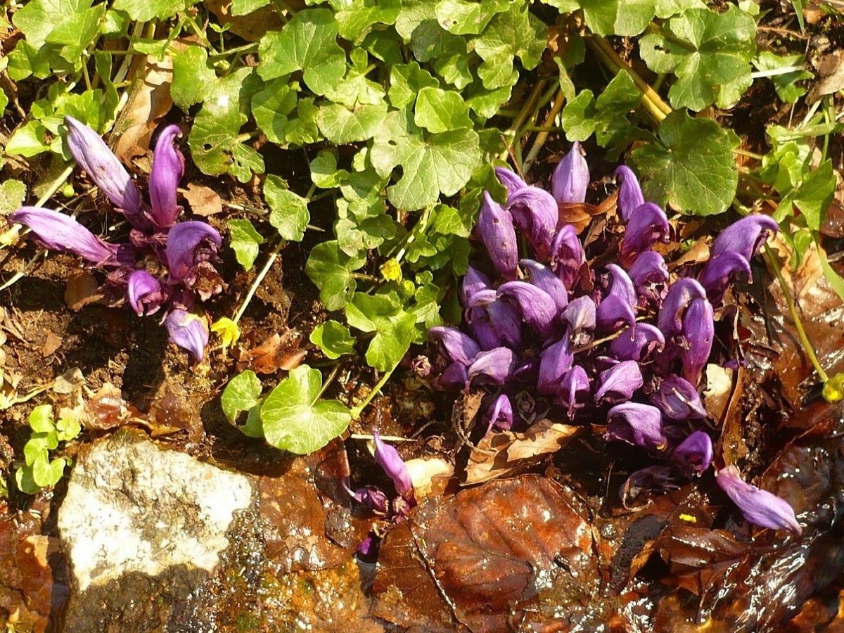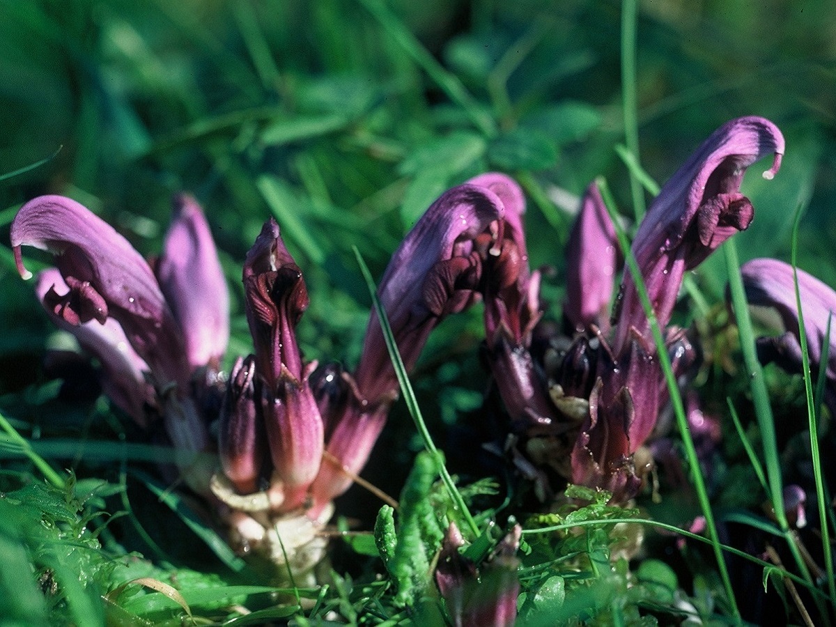 G à rhizome Par – 0,5-1 dm – Feuilles charnues en écailles blanc jaunâtre – Fleurs dressées, corolle L de 4-5 cm violette, lèvre > arquée cucullée, calice de L ≃ 2 cm lilas pâle – Capsule ovoïde