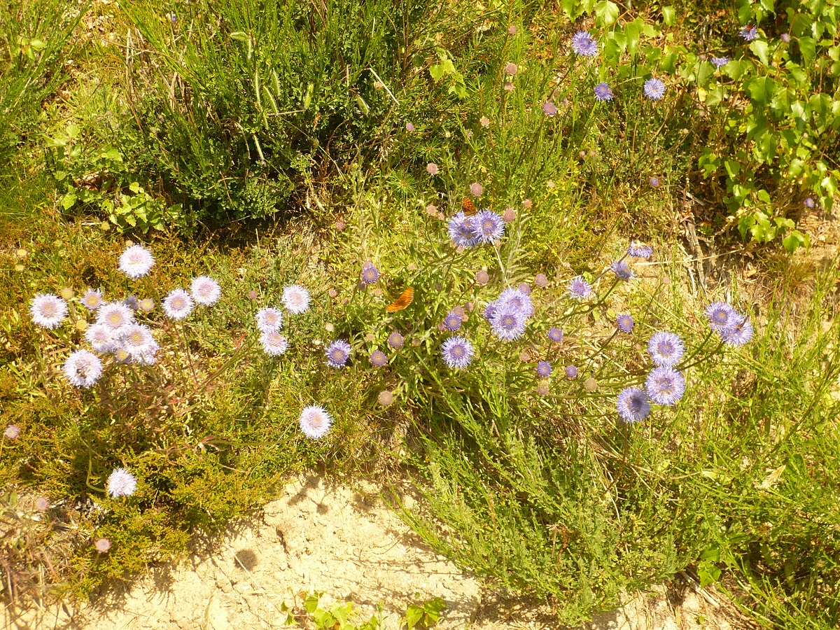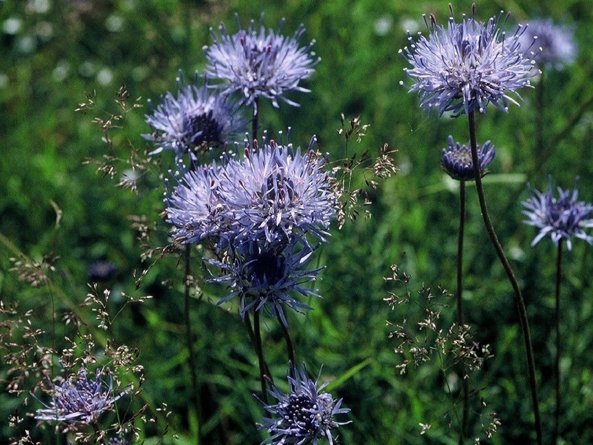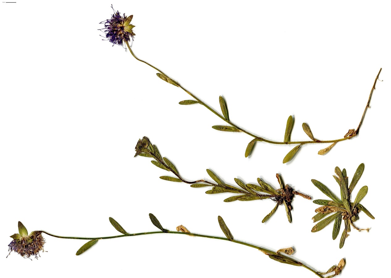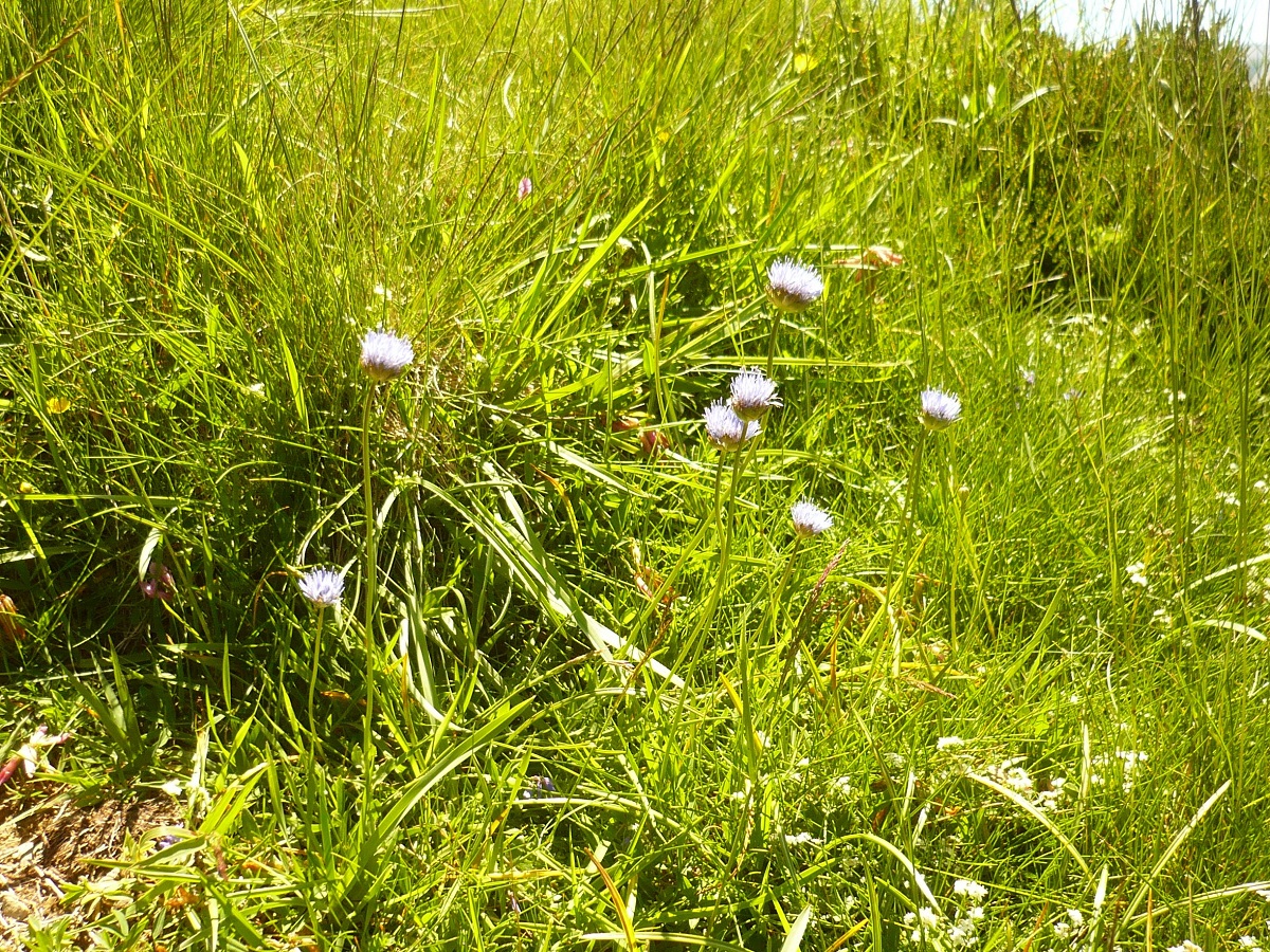 Hc – 2-4 dm – Tige simple, feuilles caulinaires 15-30 linéaires oblongues, à marge entière ciliée, les < en rosette – Inflorescence globuleuse de Ø 2-3 cm, corolle bleue, bractées ciliées