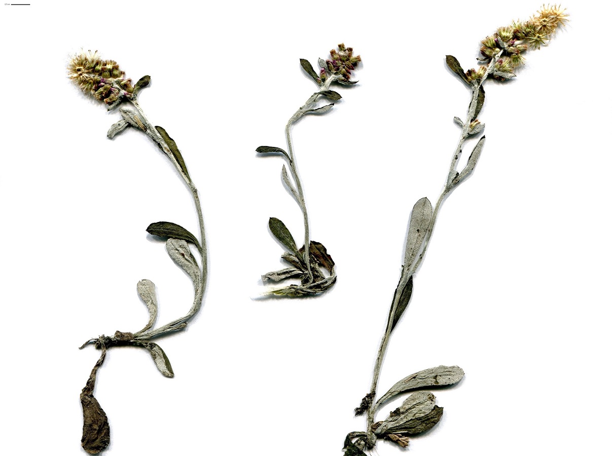 Th– 2-4 dm – Feuilles, velues grisâtres dessous, spatulées ± larges, les < pérennes – Inflorescence courte et dense, capitules ovoïdes de L 4-5 mm, à 2-5 fleurons jaunâtres ± rosés