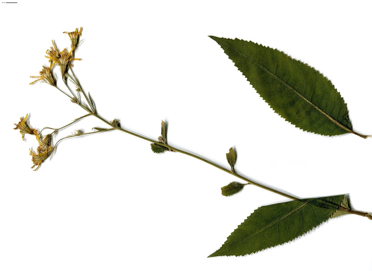 Hc – 1-2 m – Feuilles à odeur désagréable, lancéolées acuminées, à fines dents – Capitules en corymbe, 5-12 fleurs dont 4-5 hémiligulées de L ≃ 1,5 cm jaunes, bractées externes linéaires