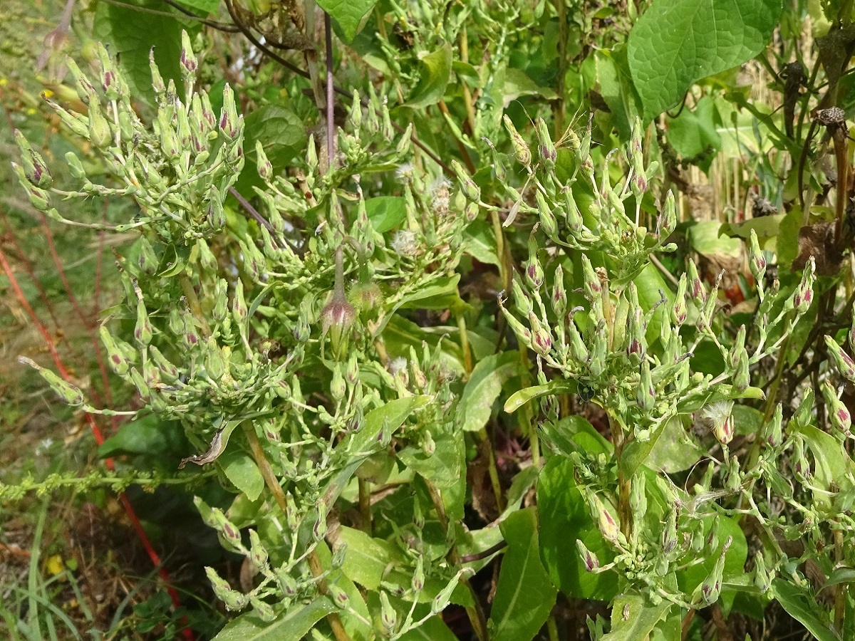 Th – 4-8 dm – Feuilles glabres larges ondulées denticulées, les > ovales auriculées – Capitules de Ø 1-1,5 cm nombreux en panicule corymbiforme, à 10-20 ligules jaune pâle