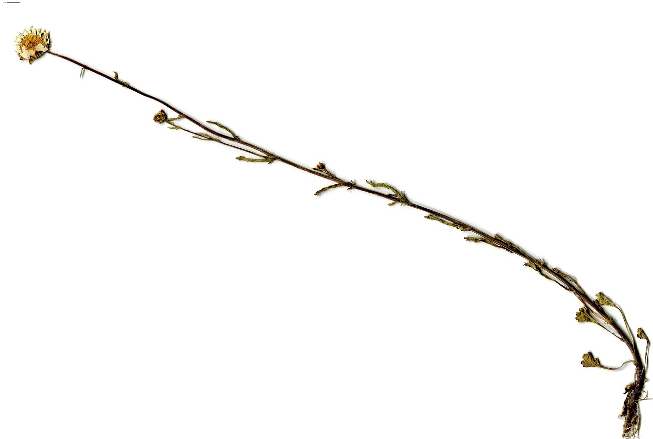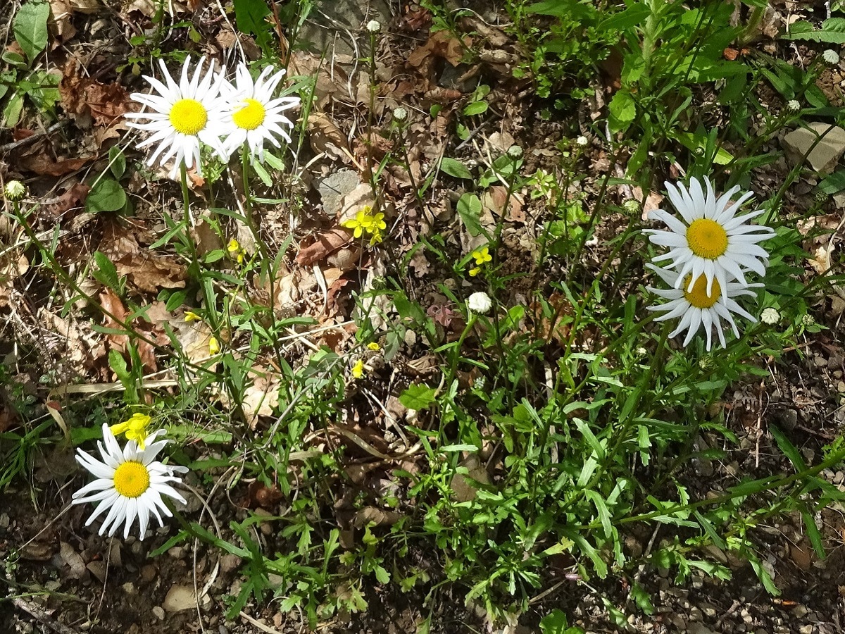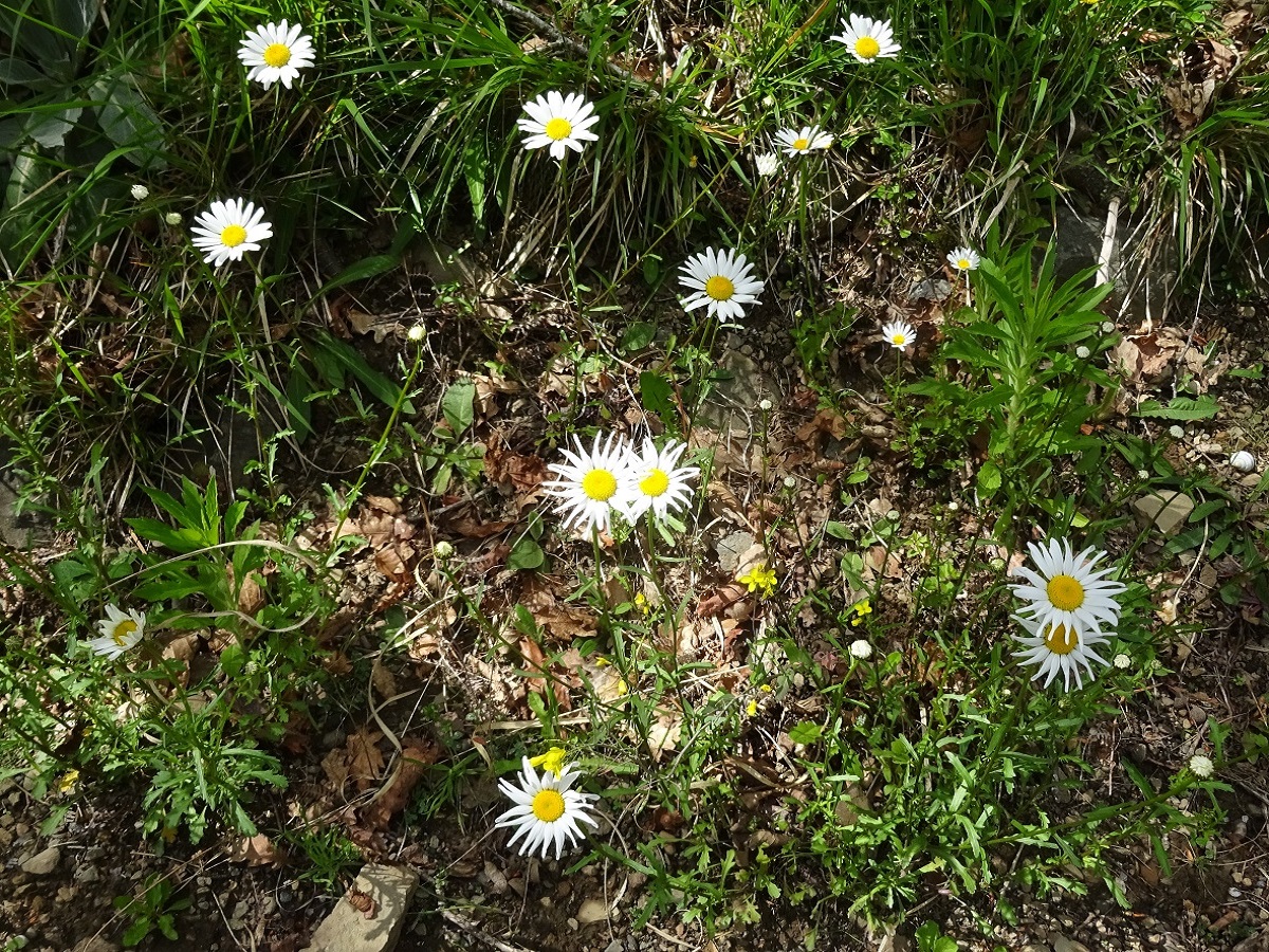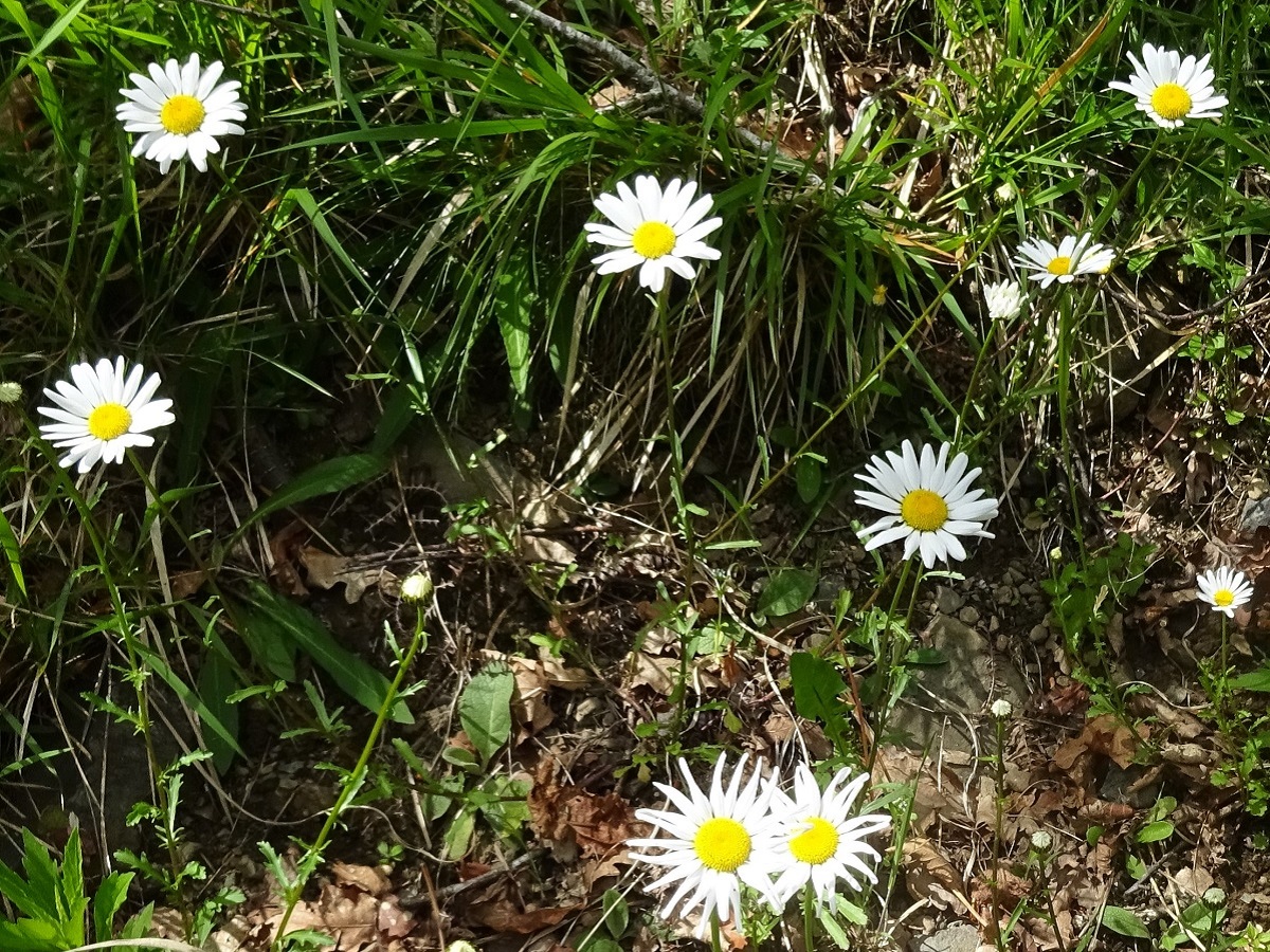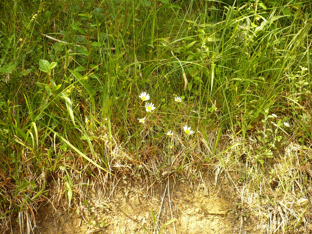 Hc – 1,5-2,5 dm – Grêle, feuilles médianes obovales étroites, dentées à lobes basaux longs – Capitules de Ø 3-4 cm, disque jaune, hémiligules blanches, bractées de L ≃ 6 mm à marge foncée