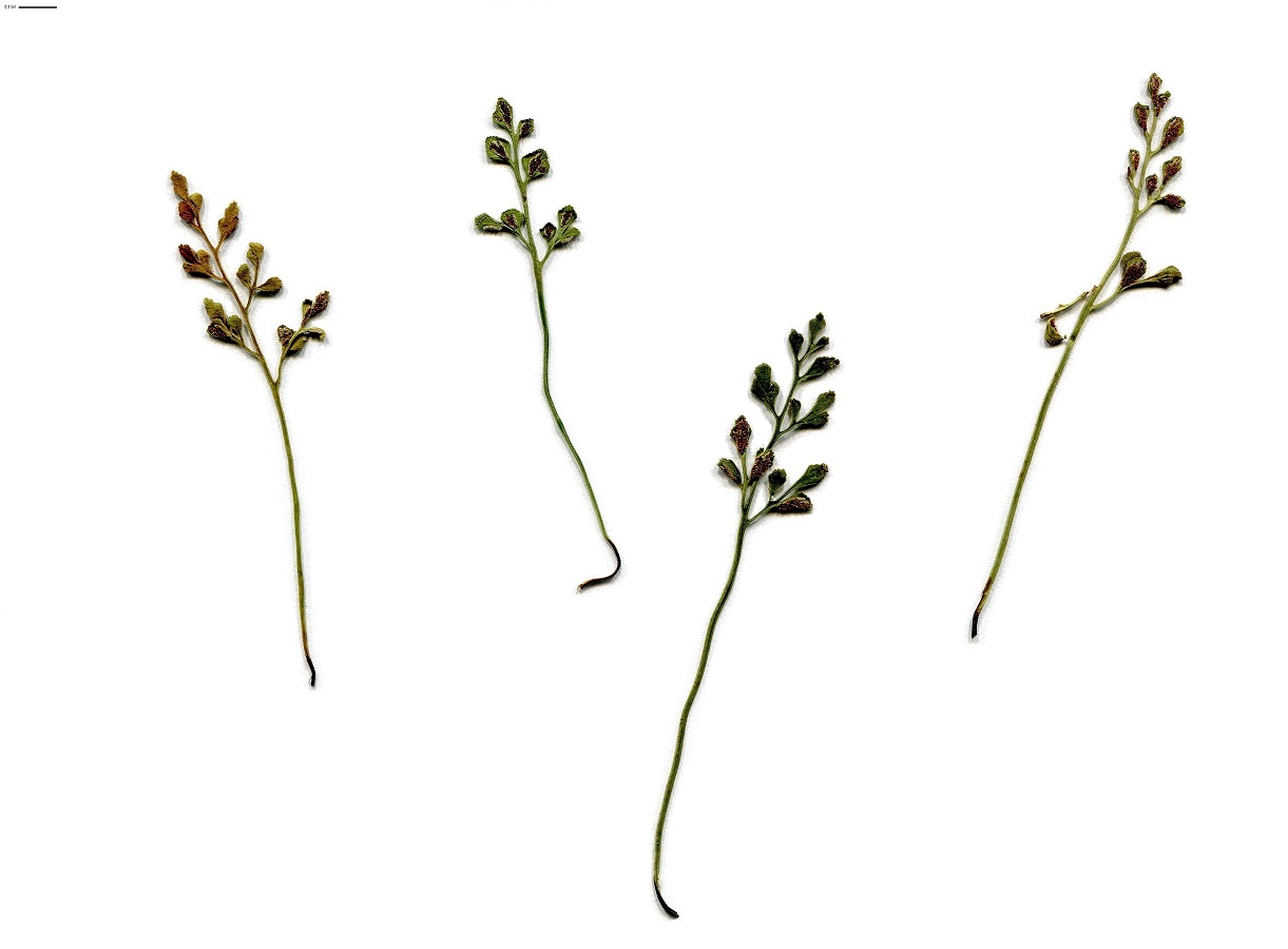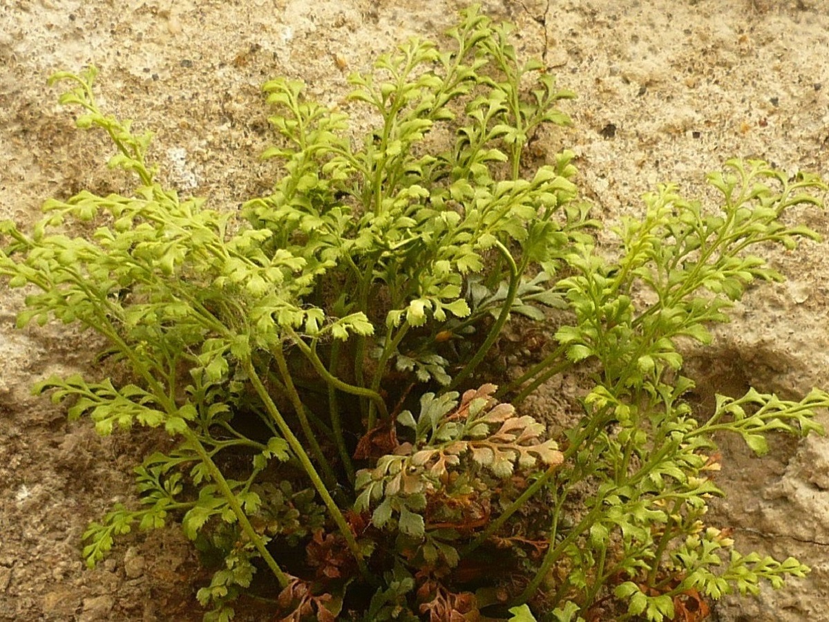 Hc – 0,5-1,5 dm – Limbe à contour ± triangulaire à pinnules entières, incisées ou divisées, pétiole long et fin – Sores bruns linéaires ± confluents à la face inférieure – En petites touffes