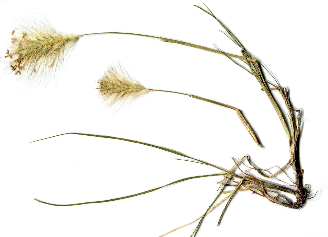 Hc – 4-8 dm – Feuilles linéaires glabres, ligule de poils – Inflorescence ovoïde oblongue de 2-12 x 2-3 cm, à longues soies de 3-7 cm brillantes, blanches à rosées, épillets de 9-14 mm de L