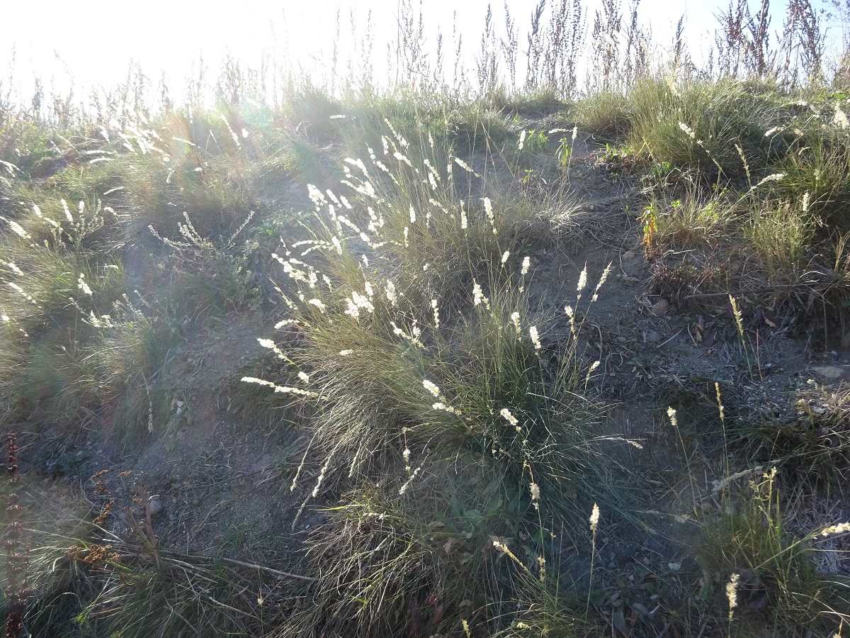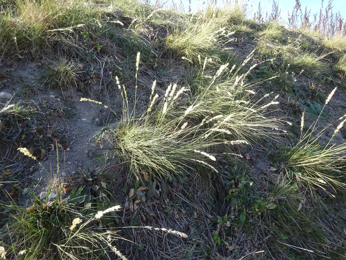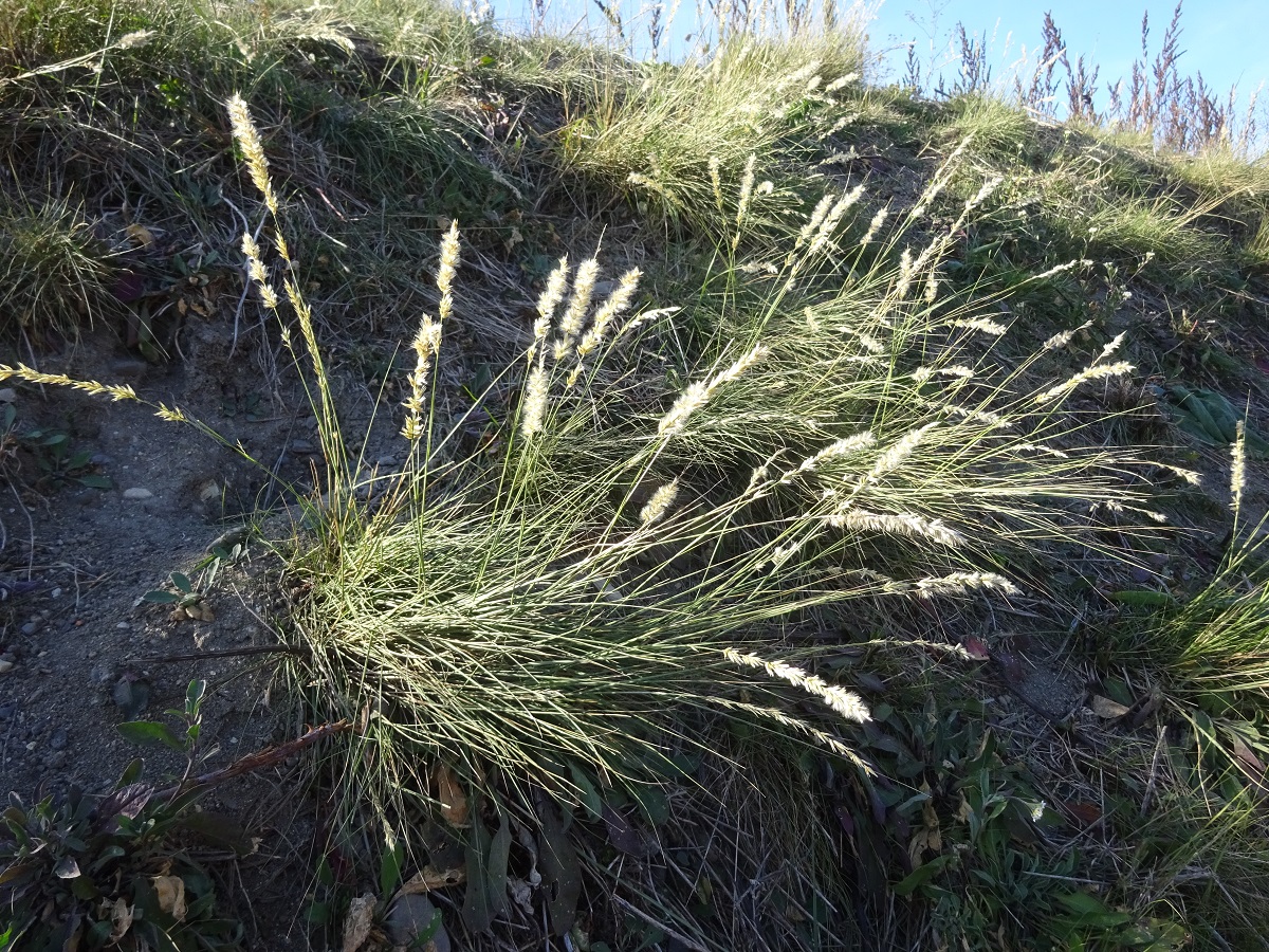 Hc – 4-8 dm – Feuilles raides, glabres – Panicule (L < 10 cm) en épi assez lâche, unilatéral, velu-soyeux, épillets (L = 5-7 mm) argentés, glumes à peu près égales, l’< à poils courts denses