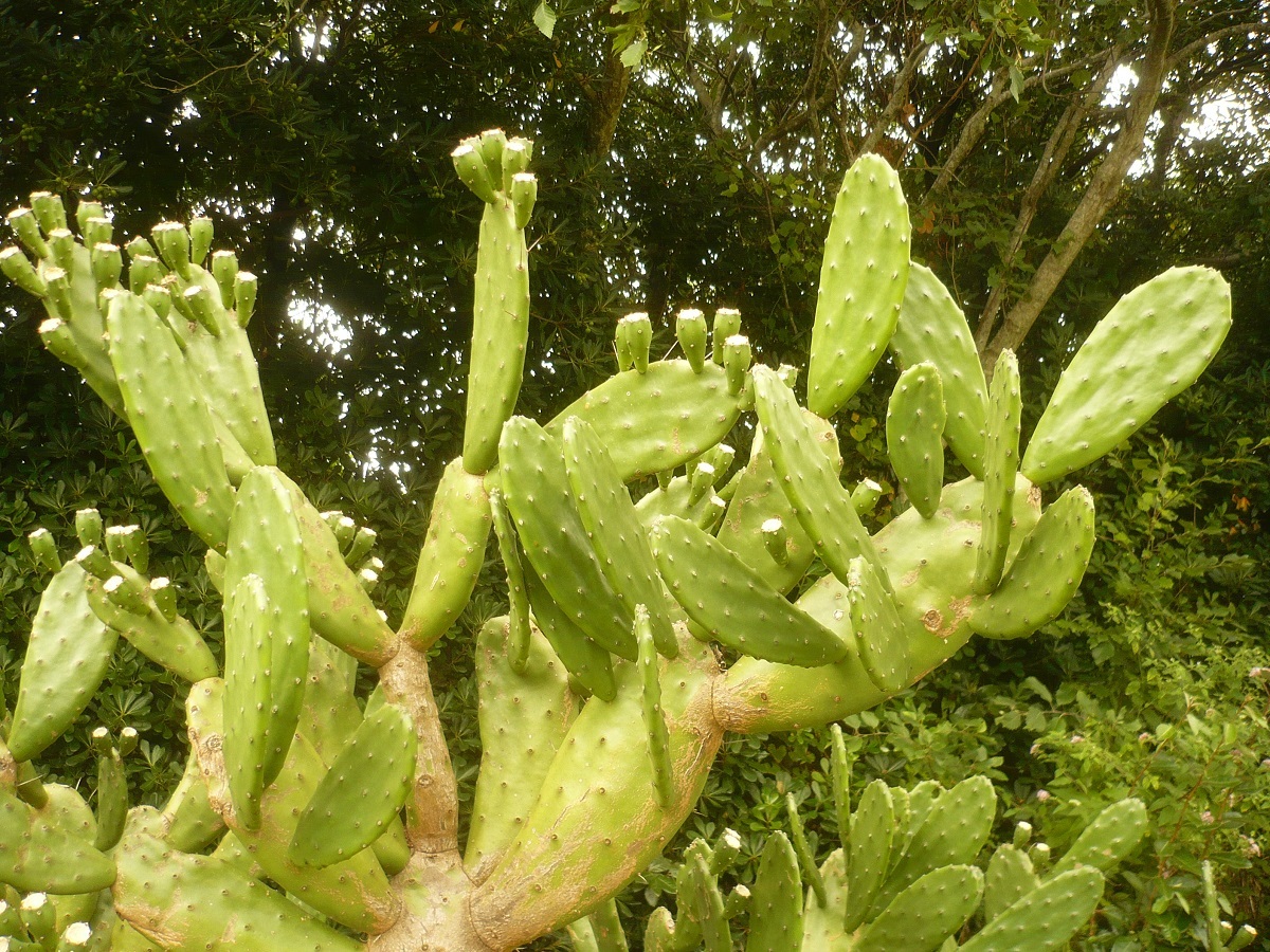 NPh – 1-3 m – Port élevé, raquettes de L ≥ 30 cm articulées charnues, ± à épines blanches – Grandes fleurs jaunes – Fruit ovoïde L de 7-9 cm charnu jaune puis rouge, ± spinescent
