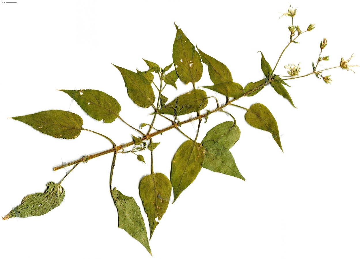 Hc – 3-6 dm – Feuilles opposées cordiformes acuminées, pétiolées, bractées > ± développées – Fleurs à 5 grands pétales blancs bifides, styles 3 – Graines à tubercules ½-sphériques