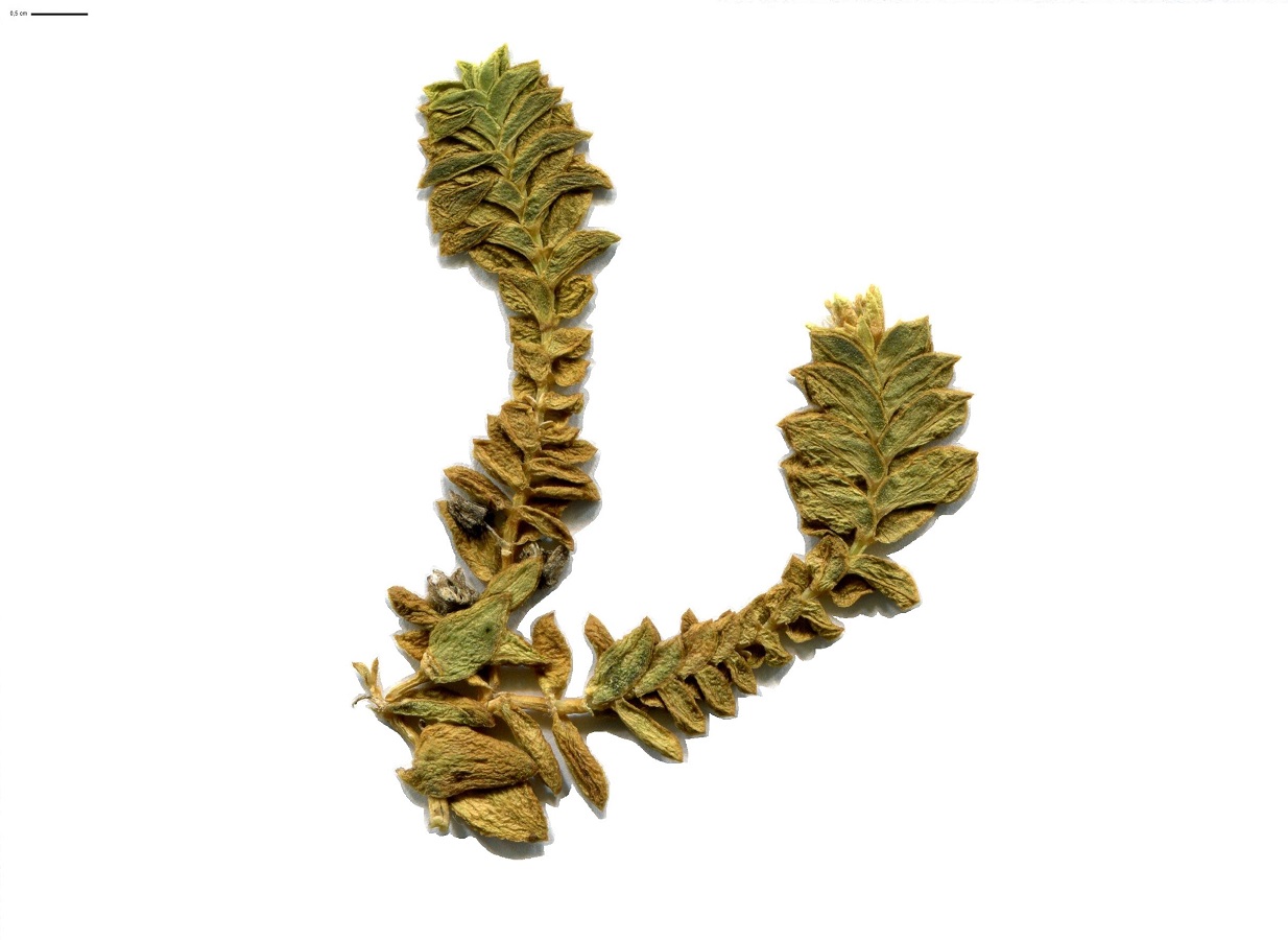 G à rhizome/Hc/Ch – 0,5-2 dm – Feuilles charnues opposées ovales-aiguës, sessiles, très imbriquées – Petites fleurs terminales à 5 pétales blancs entiers ≃ les sépales – Capsule globuleuse