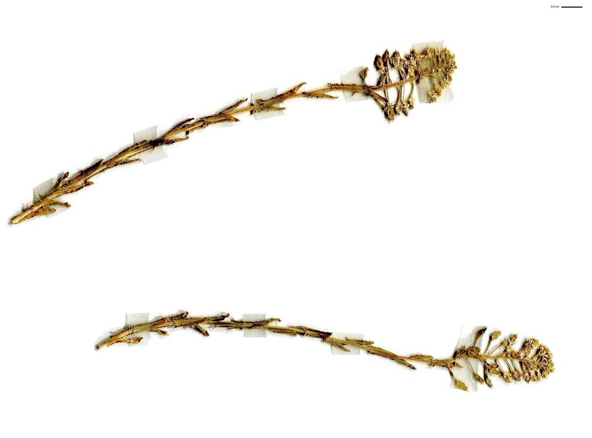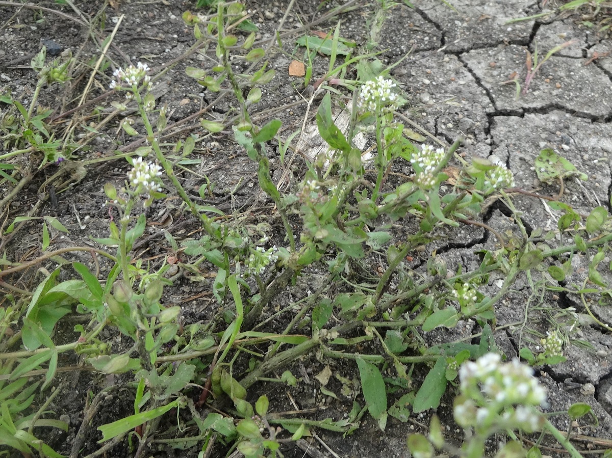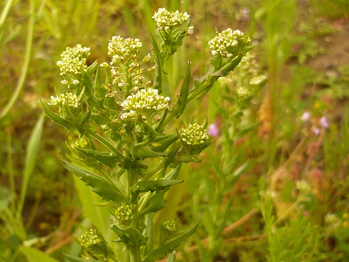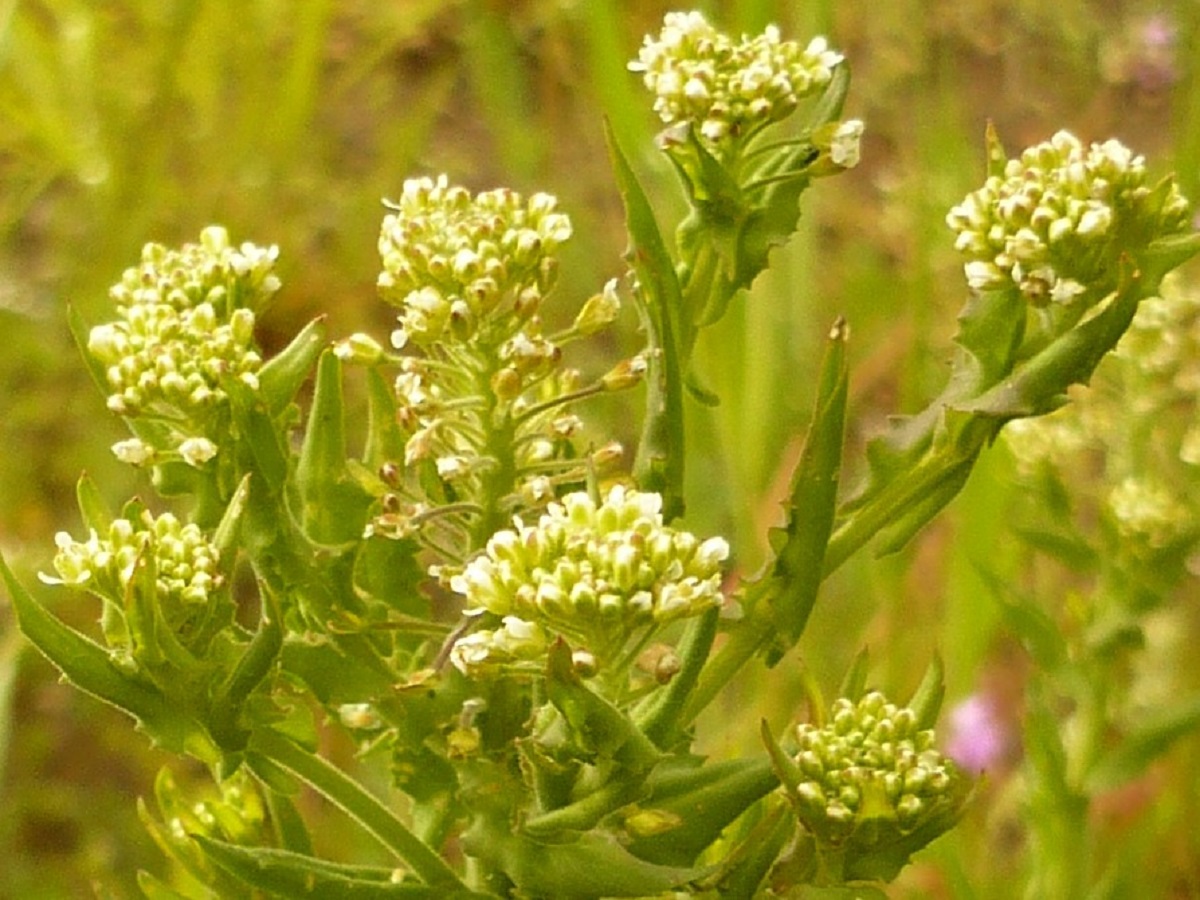 Th – 2-5 dm – Tige velue grisâtre dressée, feuilles > auriculées, les < sinuées-dentées – Grappe de petites fleurs à 4 pétales blancs – Silicules ovales échancrées, à style très court