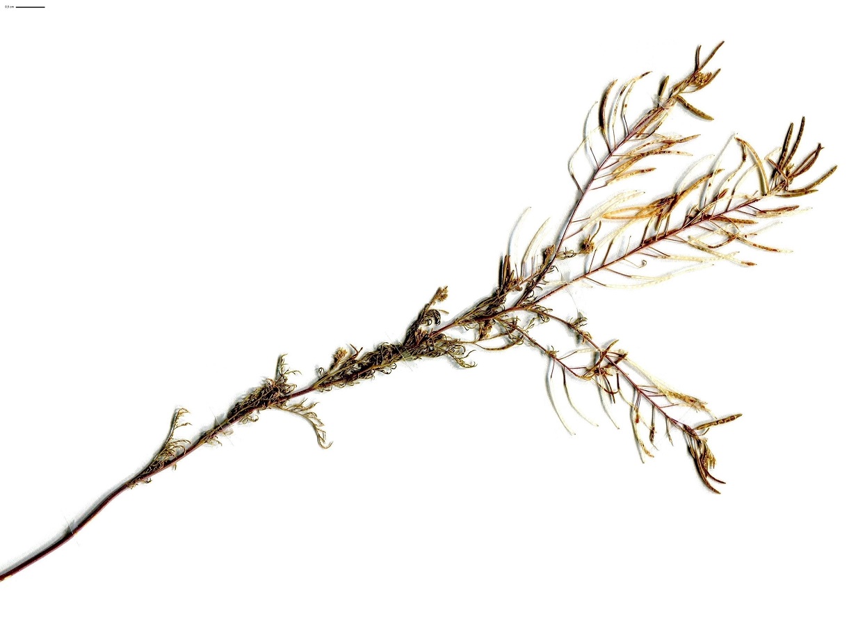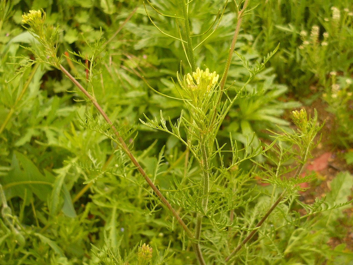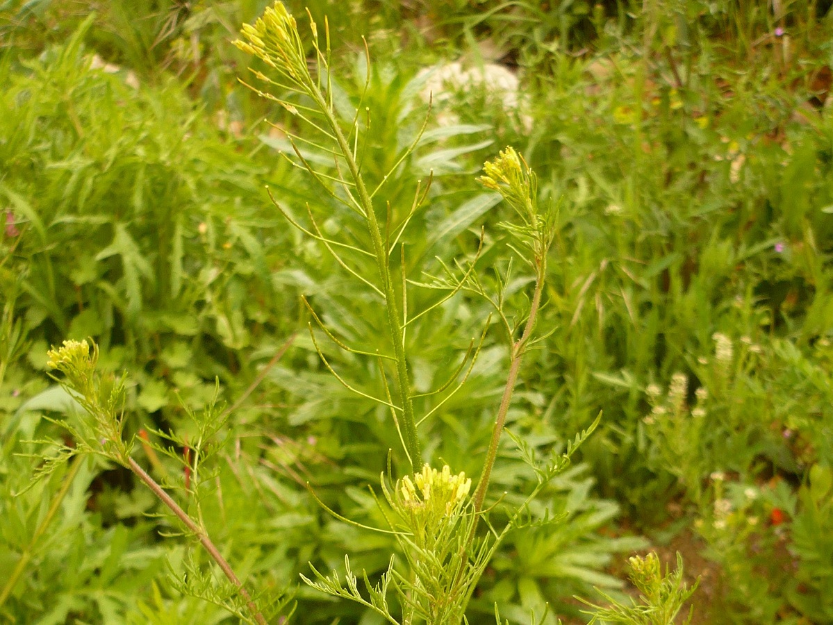 Th – 2-8 dm – Feuilles très finement divisées en segments filiformes – Grappes de petites fleurs à 4 pétales jaune pâle de L ≃ à celle des sépales – Siliques cylindriques grêles