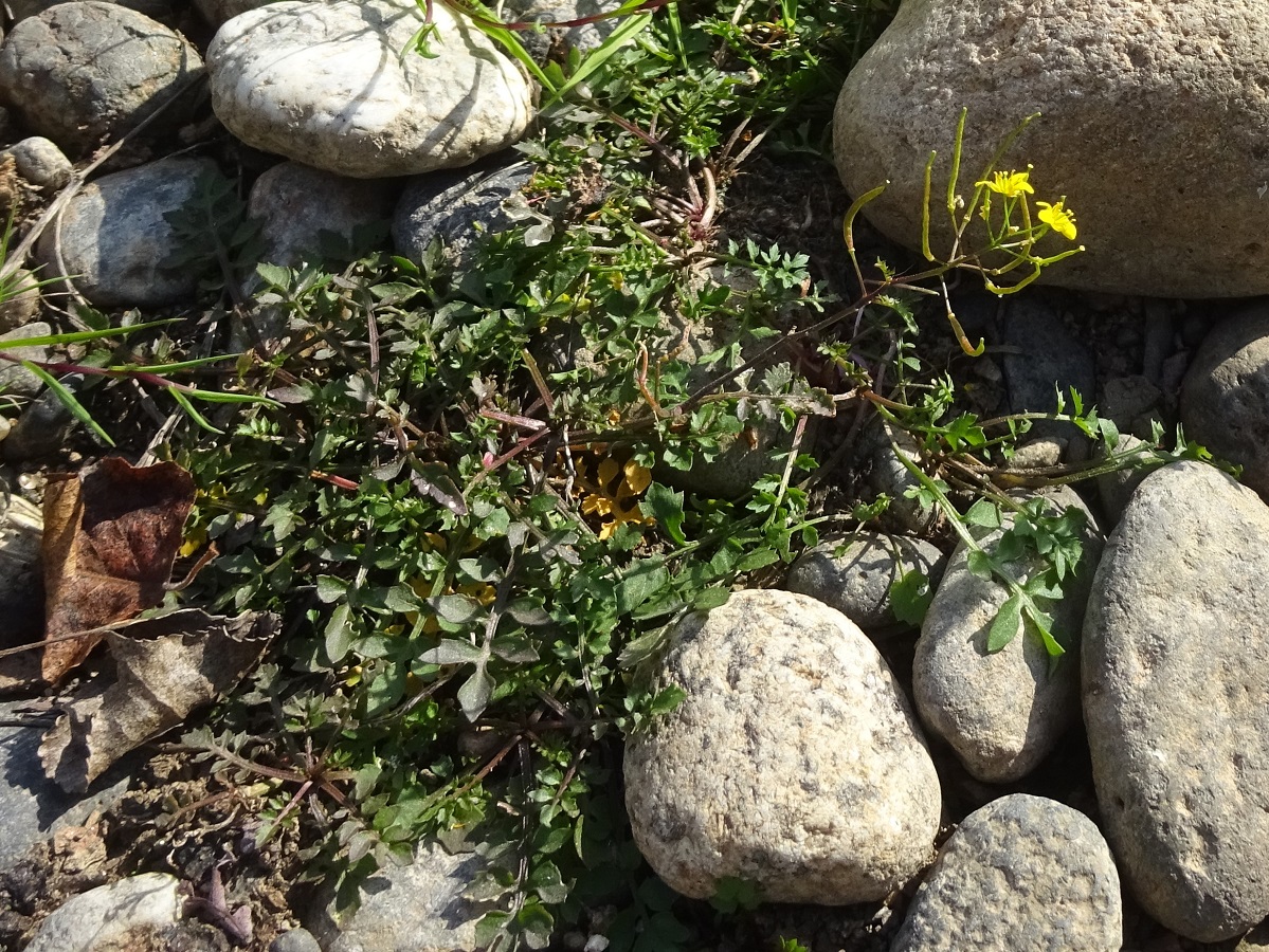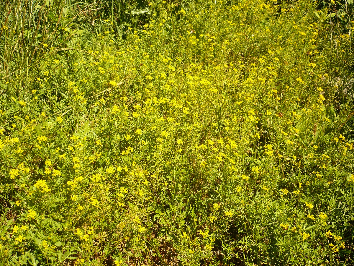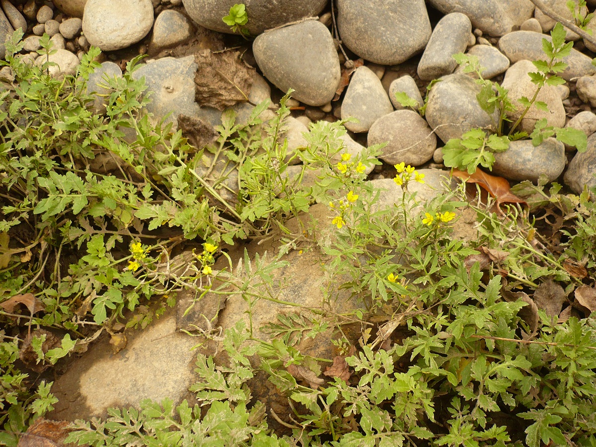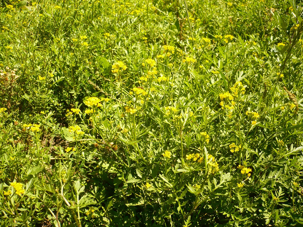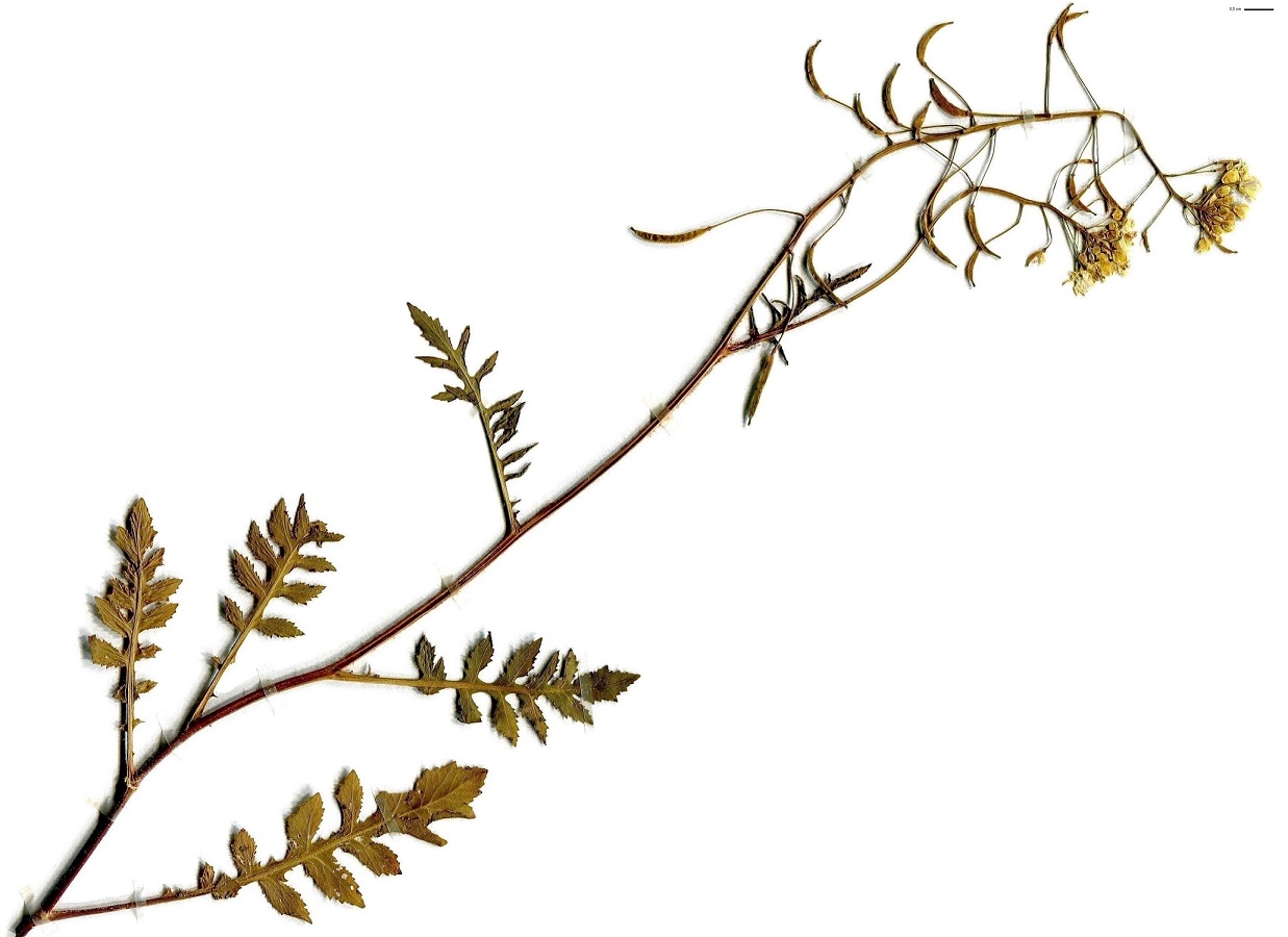 G à drageons – 2-6 dm – Feuilles découpées en lobes dentés, le terminal + grand – Grappes de petites fleurs à 4 pétales jaune doré – Silique assez courte arquée ≃ le pédoncule étalé