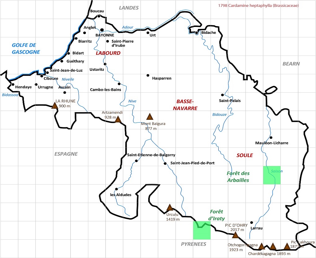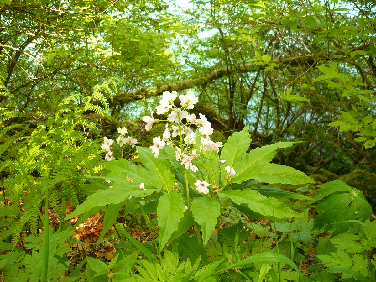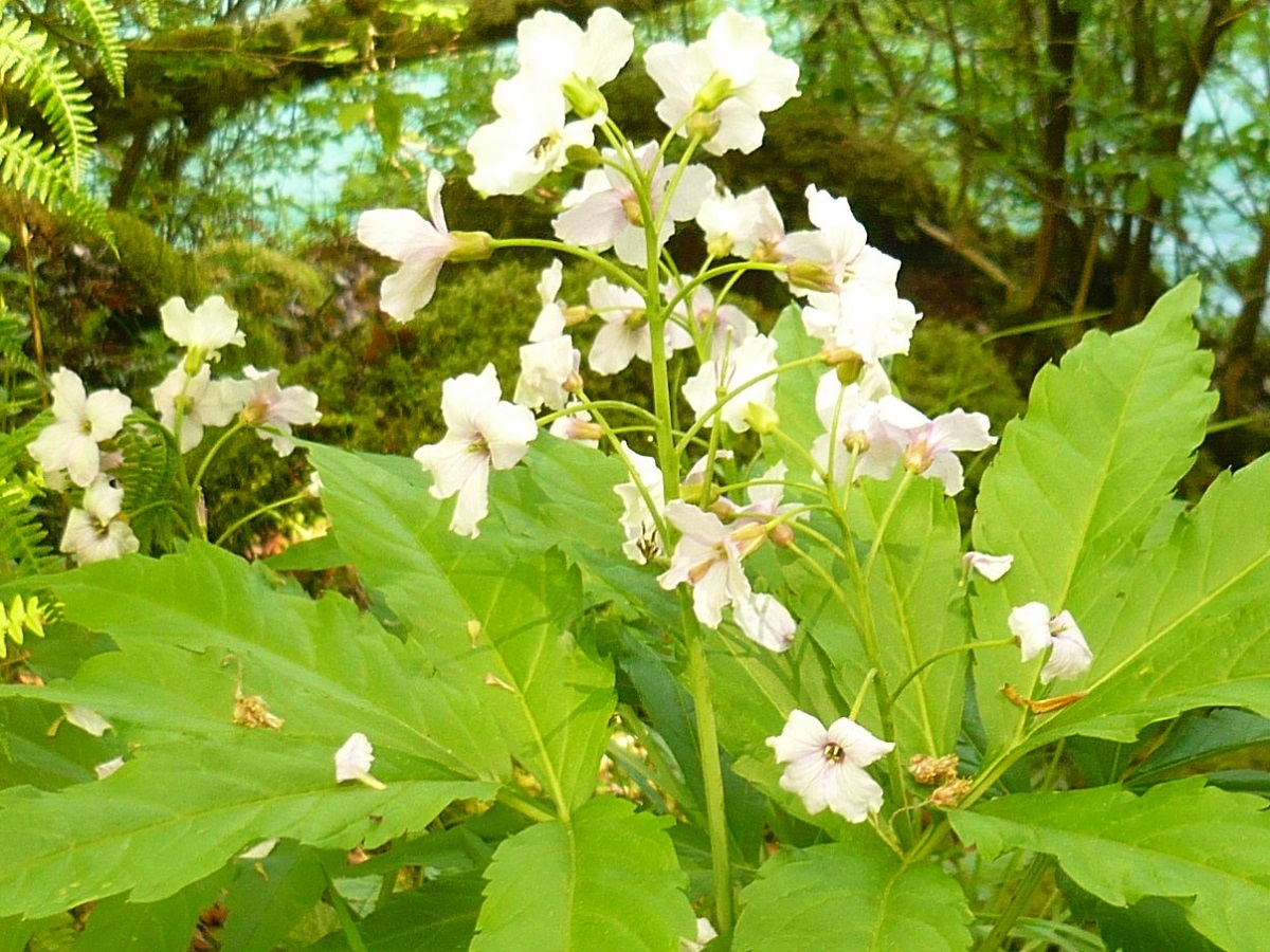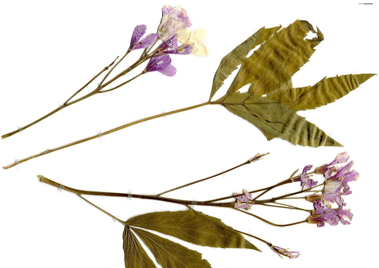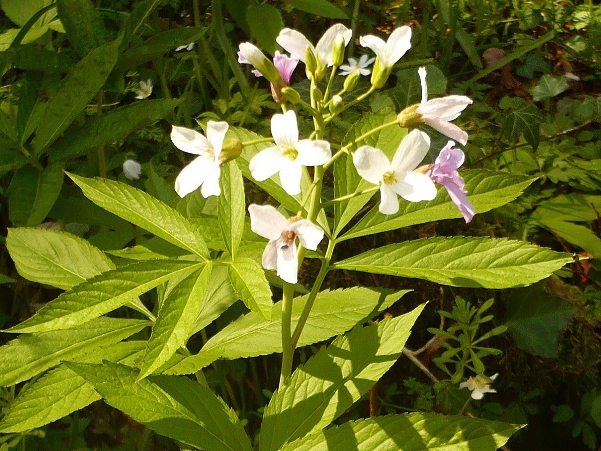 G à rhizome – 3-6 dm – Feuilles pennatiséquées à 5-7(9) folioles lancéolées-dentées – Grappe lâche de grandes fleurs à 4 pétales blancs à lilacés – Siliques courtes et étroites