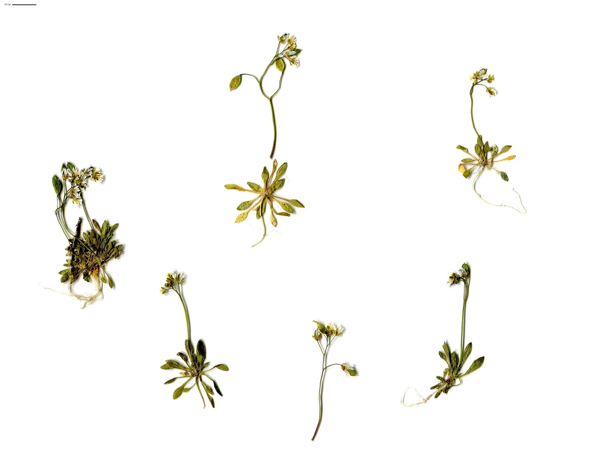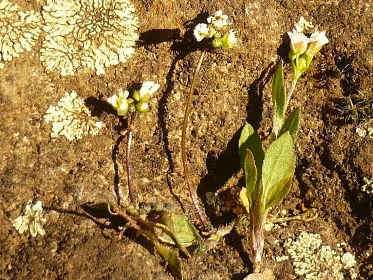 Th – 0,5-1 dm – Naine, petites feuilles lancéolées-spatulées en rosette, à longs poils simples – Fleurs à 4 petits pétales blancs bifides – Silicules elliptiques de 3-5 mm de long
