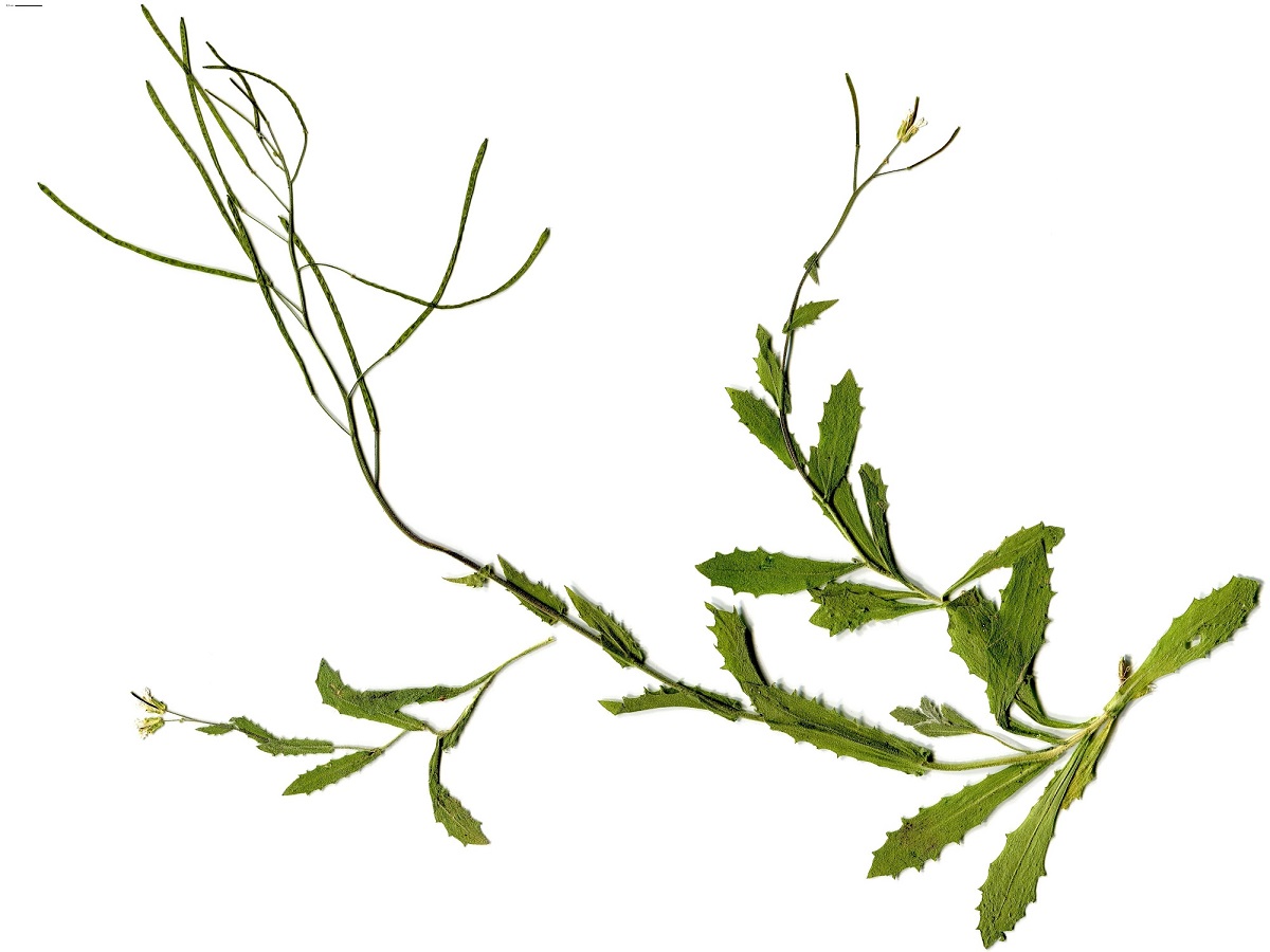 Ch – 1-4 dm – Port ± diffus, feuilles velues, oblongues dentées, les > embrassantes – Fleurs à 4 pétales de L ≃ 1 cm larges, blancs – Siliques L de 2-4 cm flexueuses, comprimées