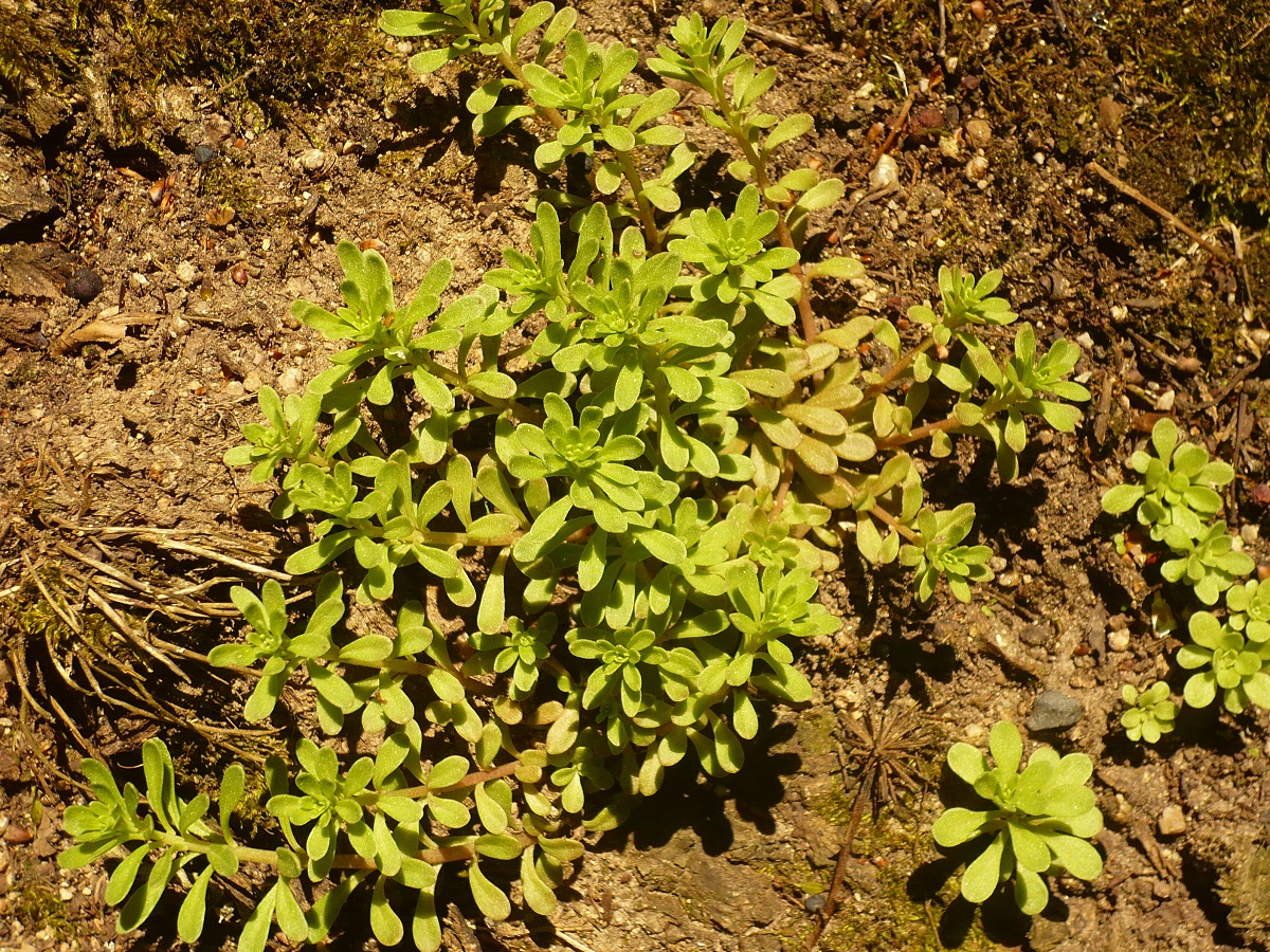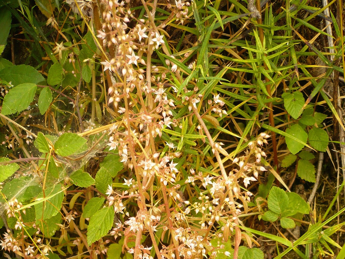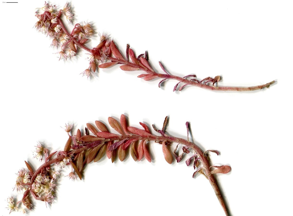 Th – 1-4 dm – Feuilles charnues aplaties spatulées, opposées ou verticillées – Longue inflorescence de petites fleurs à 5 pétales blancs, 10 étamines – Carpelles ovoïdes acuminés dressés